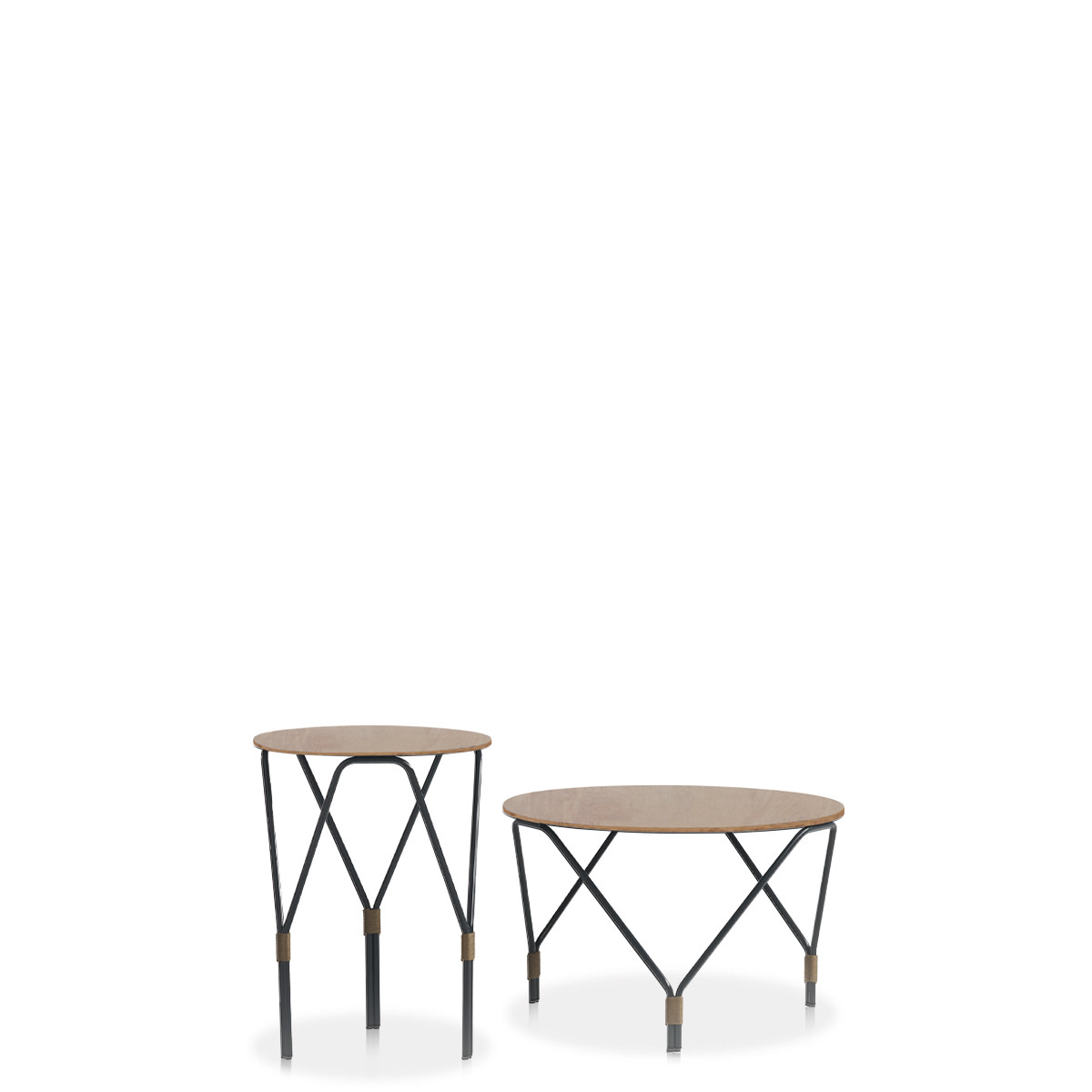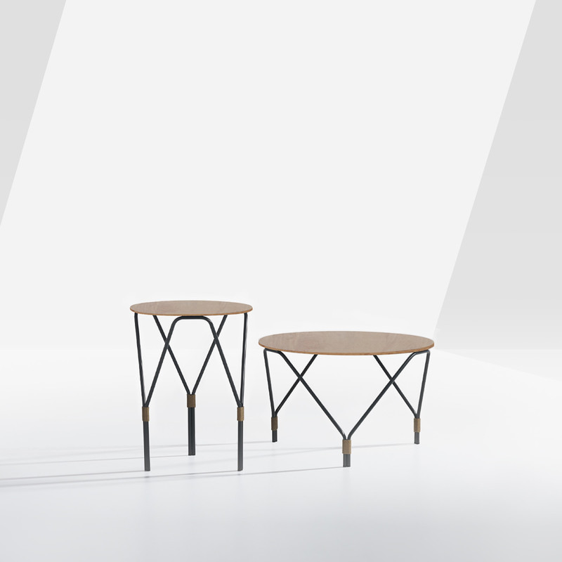 The structure of these tables is as simple as it is distinctive: the three thin metal tubulars of the legs, embellished by the hand woven rope around the meeting points between them, form a visual intersection that changes with the point of view.