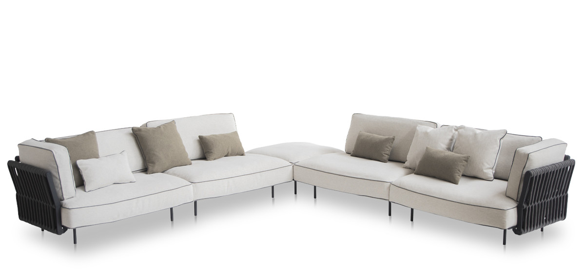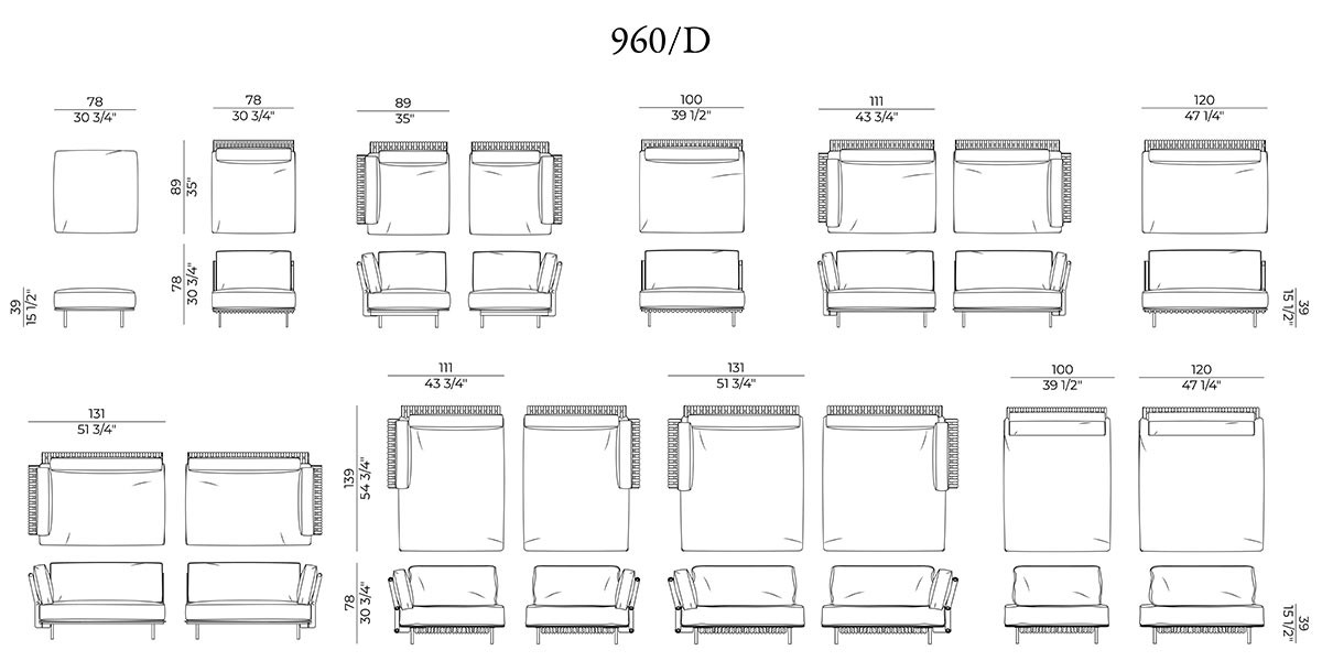 The modularity of the frame allows you to structure armchairs and sofas in closed, double-sided or corner compositions, with integrated pouf and chaise longue.