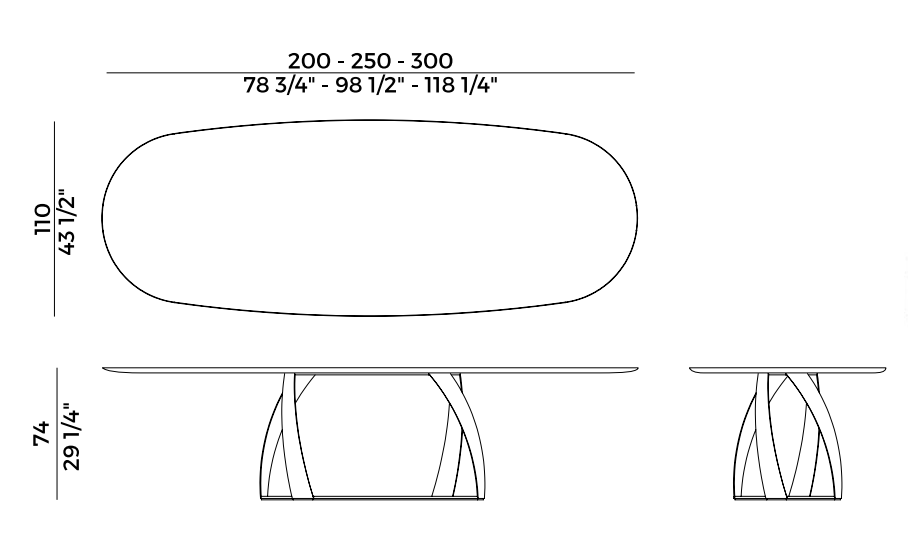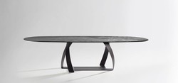 Table with elongated base and rectangular top in Canaletto walnut, marble or transparent tempered glass. Materials as per collection.