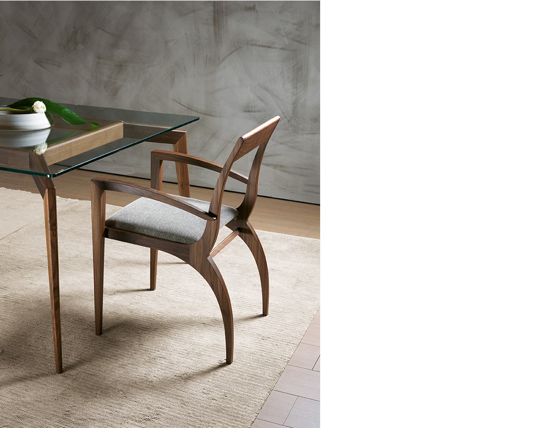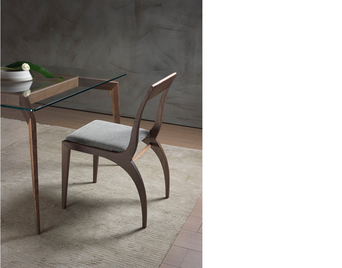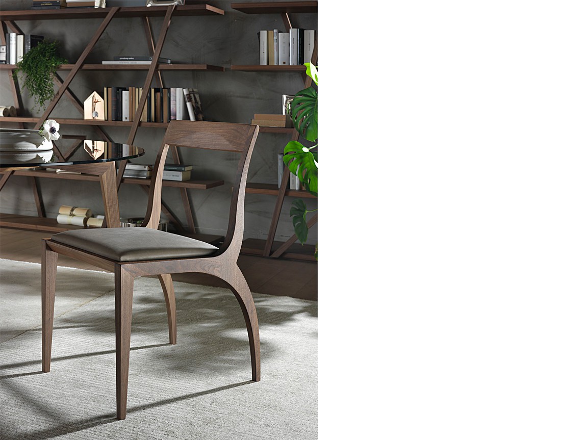 La sedia e poltroncina Thelma hanno una struttura in massello di noce canaletto. Seduta rivestita in pelle, ecopelle o tessuto della collezione. Rivestimento seduta in tessuto fisso o sfoderabile. Finiture disponibili: WG wengé, NK noce canaletto.