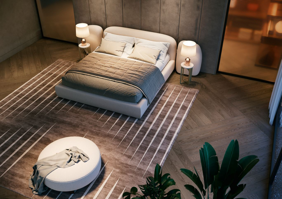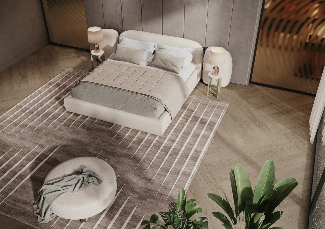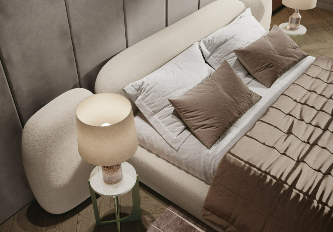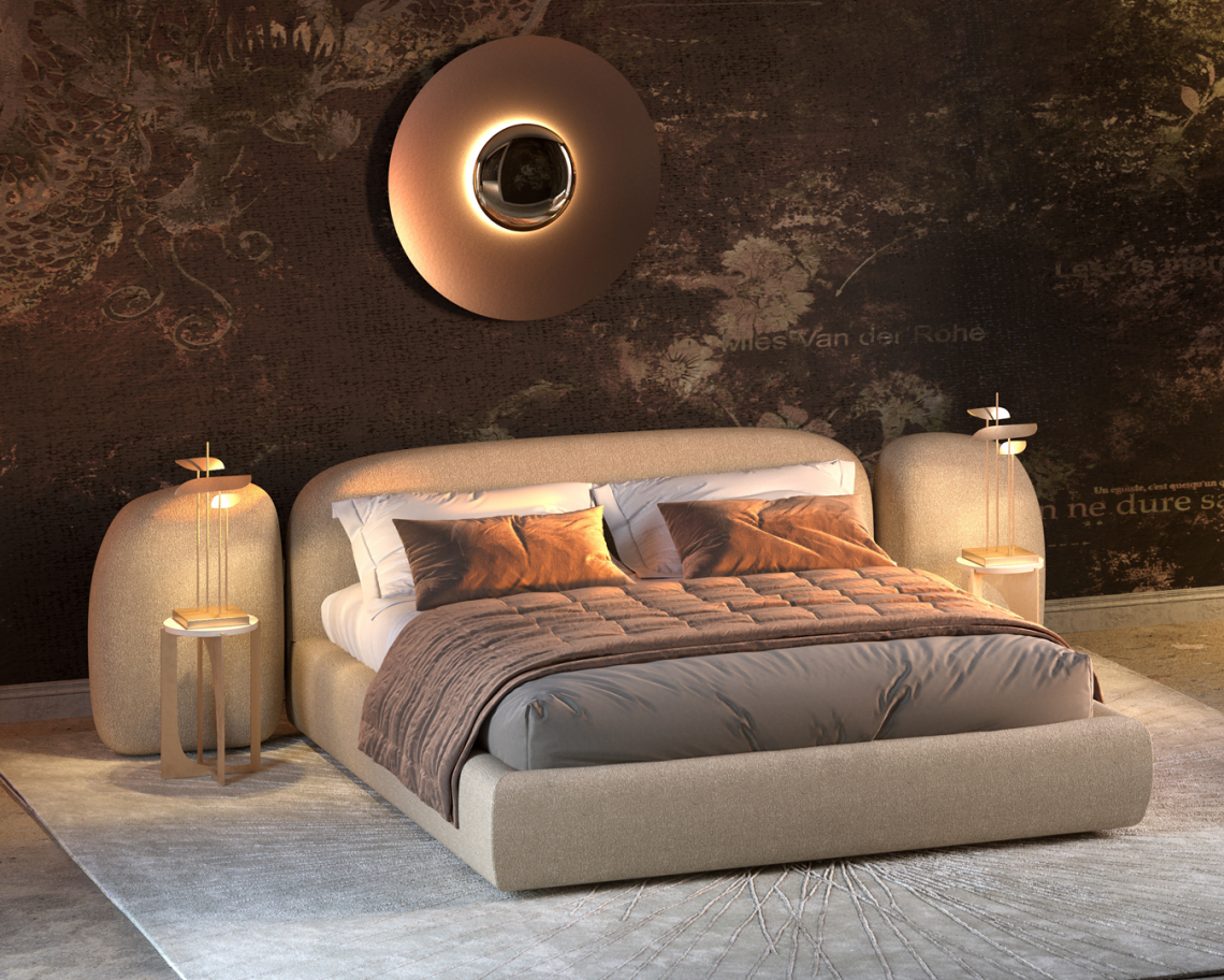 legno massello di frassino eco-sostenibile da filiera certificata. Testata e giroletto imbottiti sono realizzati con gomme biologiche e ovatta naturale. Anche il rivestimento in lana bouclé ha un’anima naturale. Le “ali” laterali, mobili, abbracciano i comodini e rendono il prodotto più avvolgente.