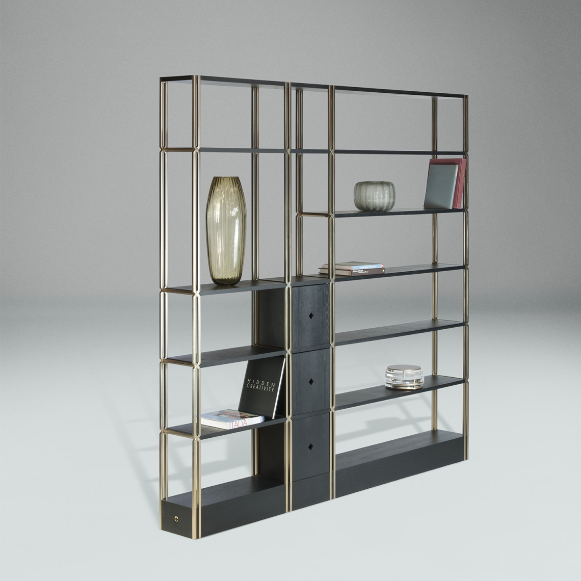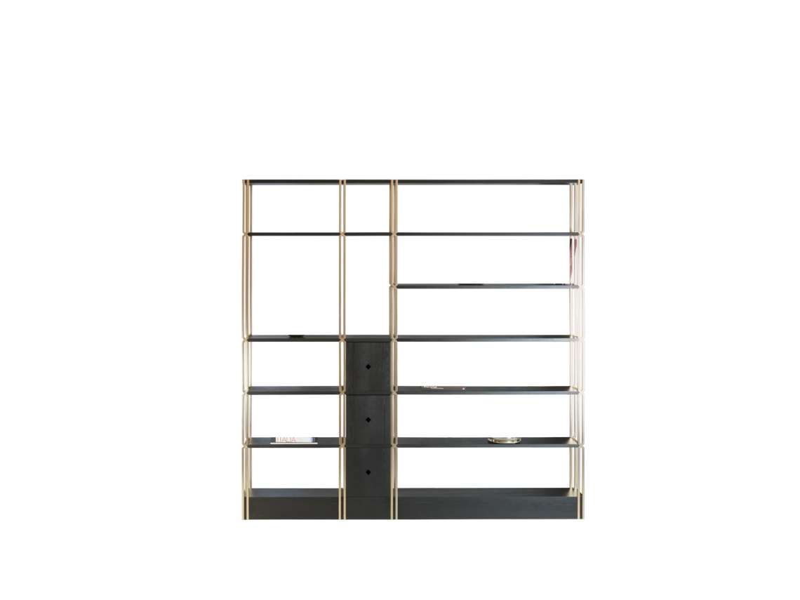 La libreria è composta da montanti intrecciati tra loro in acciaio con finitura oro opaco dipinta artigianalmente a sezione quadrata, che si incrociano a 45 gradi, formando un particolare disegno a croce. I ripiani e lo zoccolo sono rivestiti in essenza frassino black. Infine, la libreria si correda di 3 cassetti in legno, con la medesima finitura.