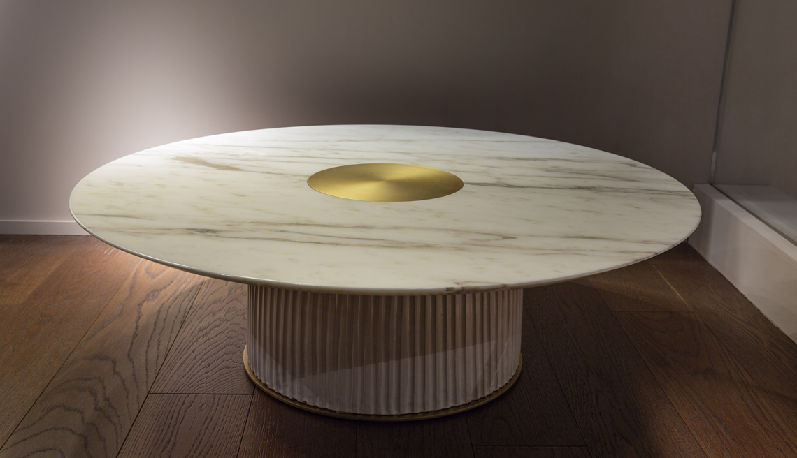 Tavolini scultorei che abbinano, in forme diverse marmo, metallo verniciato oro opaco e la ceramica artigianale finemente lavorata a Vietri.