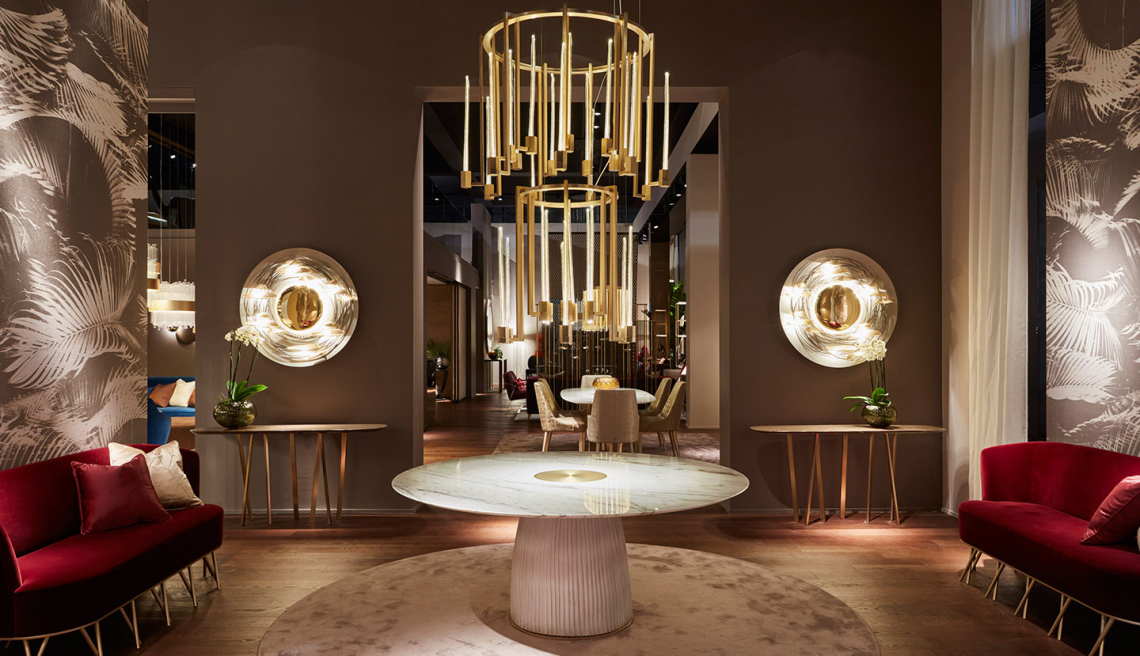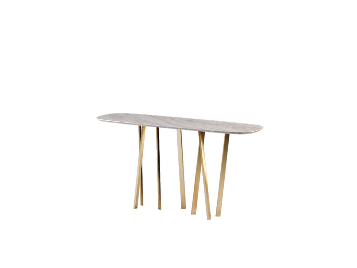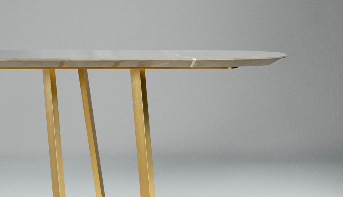 è realizzato con un piano ovale e angoli ad ala di gabbiano in pregiato marmo. La base si compone di 7 gambe in metallo con finitura oro opaco, disposte con diverse inclinazioni e saldate a un disco di fissaggio in metallo che viene fissato al piano tramite viti metalliche. Spessore piano 2cm.