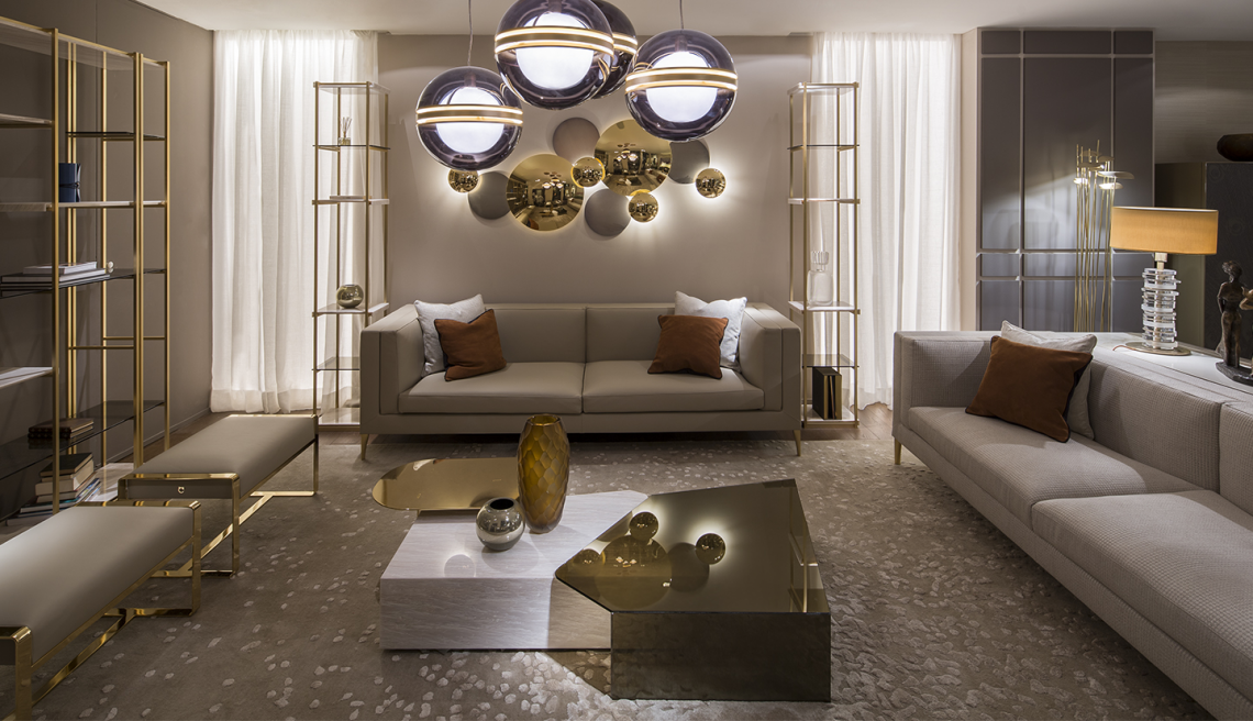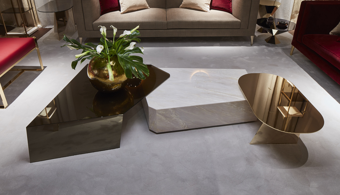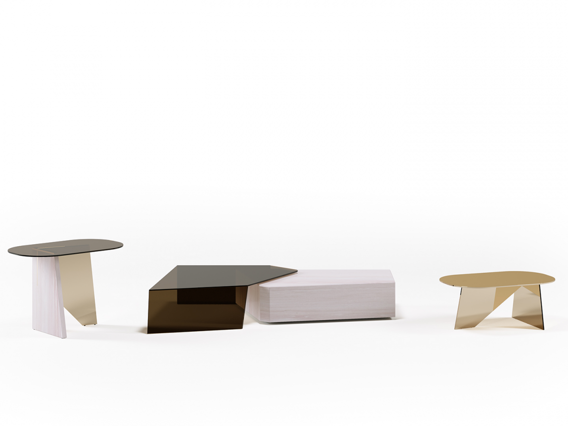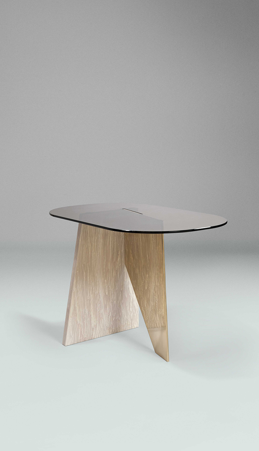 SIDE – Tavolino realizzato con 3 lastre in materiali diversi – marmo Rosa Egeo, metallo con finitura oro lucido, vetro color Avana – combinati tra loro e posizionati ad incastro.