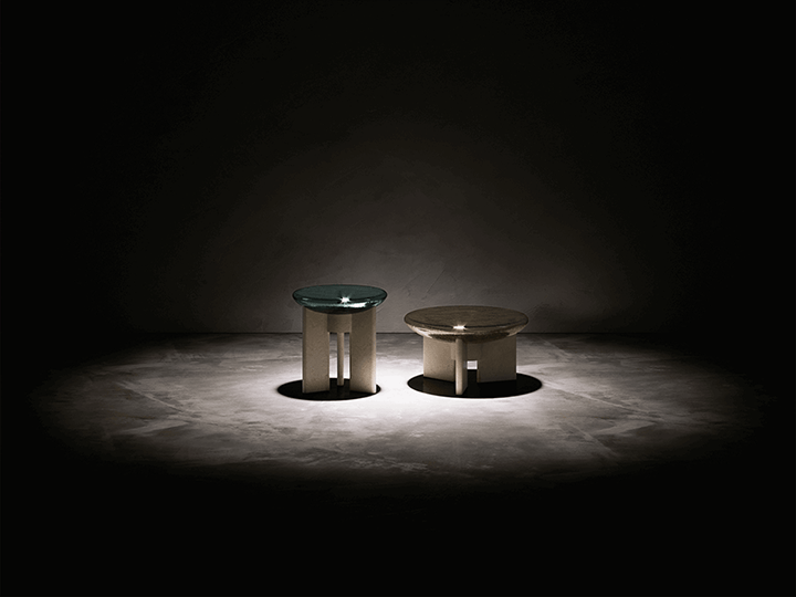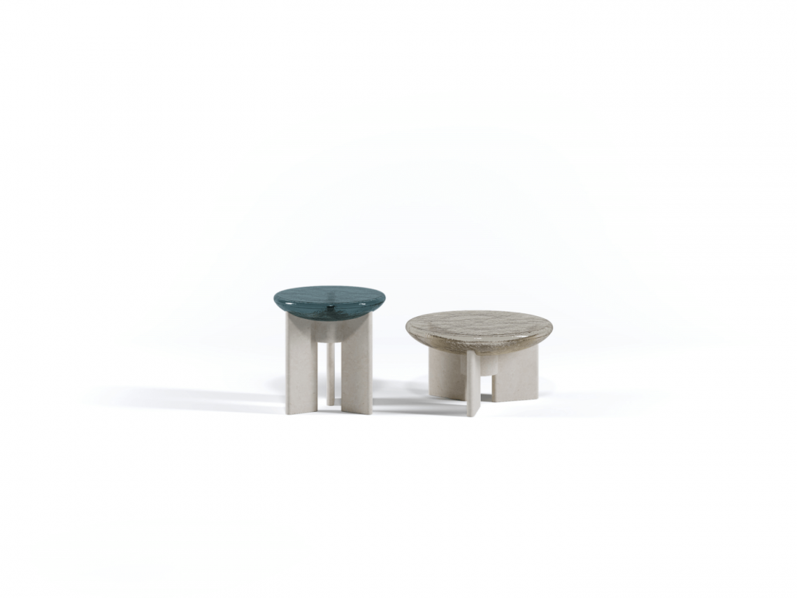 Tavolini con base in pietra vicentina levigata col. avorio formata da tre lastre verticali fissate a un disco centrale. Piano realizzato in vetro di Murano soffiato a bocca, con effetto ondulato interno che impreziosisce l’oggetto.