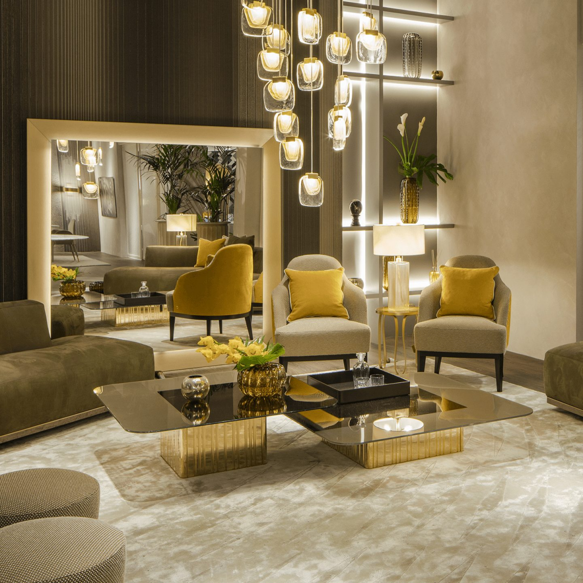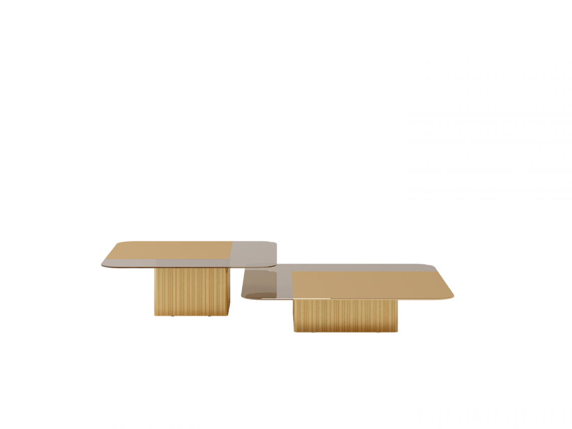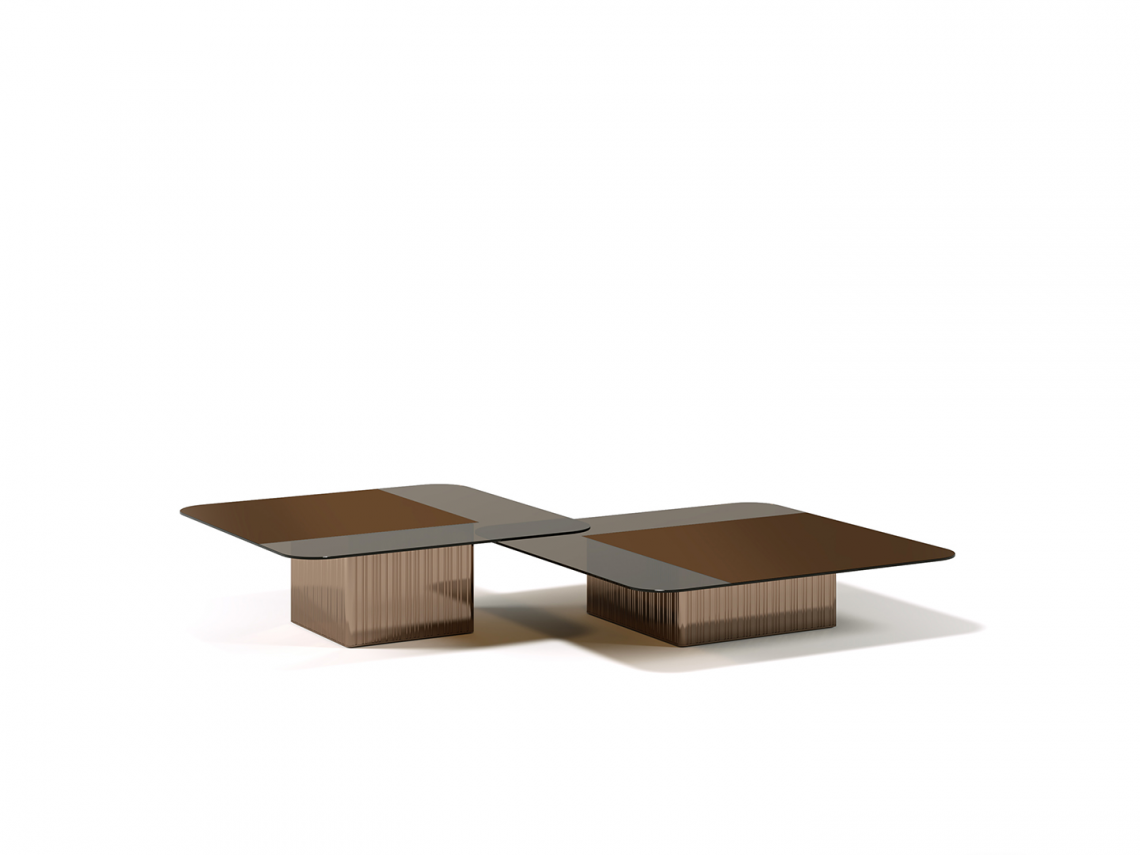 Collezione di tavolini caratterizzati da una sofisticata semplicità delle linee, declinata in una scelta di materiali di grande pregio per suggerire un modo diverso di pensare lo spazio abitato. Top in vetro bronzato con un lato parzialmente specchiato, o in alternativa retrolaccato, base in metallo plissettato finitura lucida bronze shadow o oro.