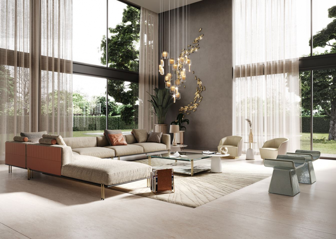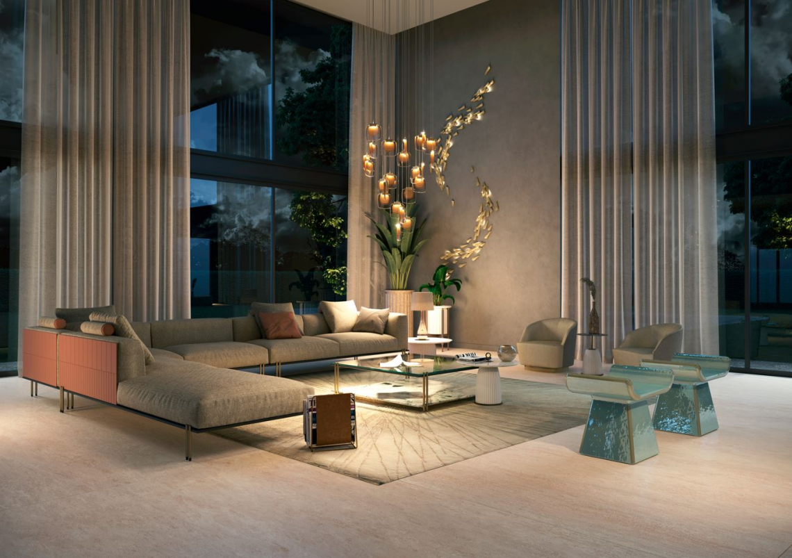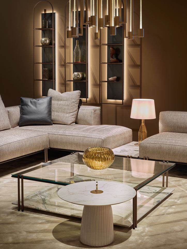 La base in metallo finitura nero opaco, con doppi piedini in metallo finitura bronzo opaco, evidenzia la leggerezza complessiva del progetto, sostenendo il ripiano superiore in vetro colore Avana e quello inferiore in pietra Pece. In alternativa, il tavolino può essere configurato con il vetro trasparente extra-chiaro ed il ripiano inferiore in marmo Lunar Breccia.