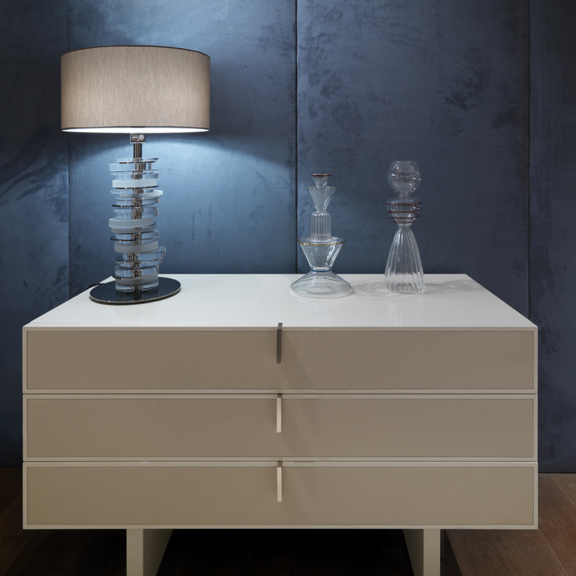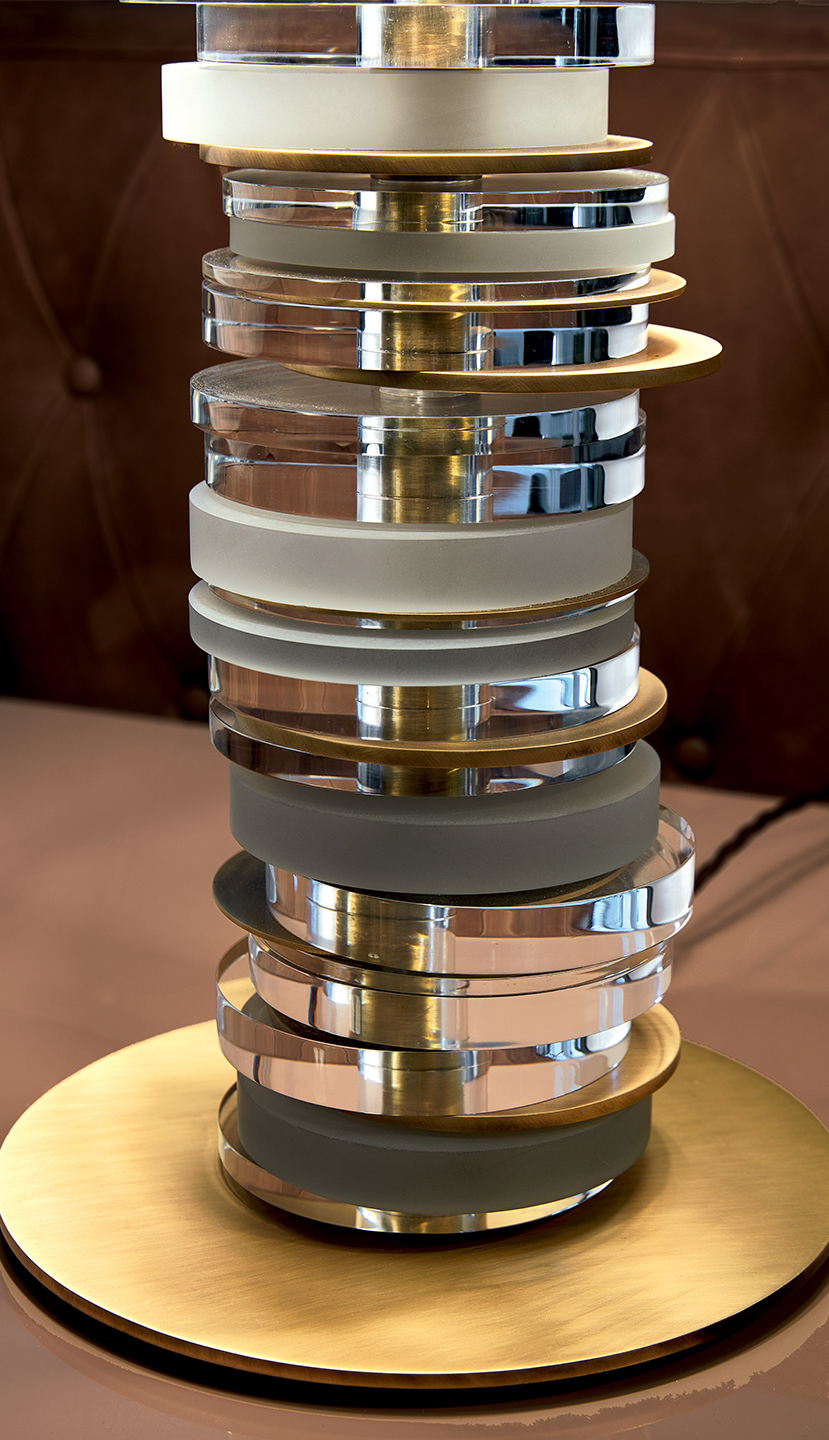 Questa lampada è composta da un’asta in ottone con finitura oro scuro o rutenio nella quale sono inseriti e ruotano dischi in lucite alternati a metallo con trattamento galvanico che creano un sofisticato gioco di trasparenze e riflessi di luci. Ambra è completata nella parte superiore da un prezioso cappello in seta in tono con i metalli.