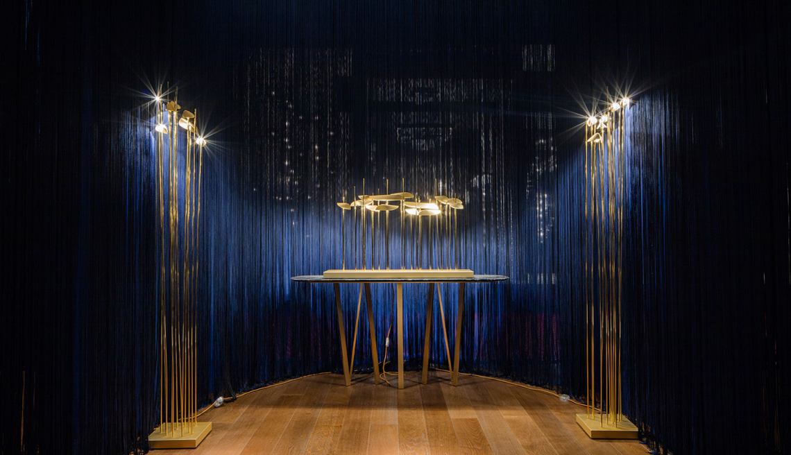 ANODINE MINI: è composta da 3 steli in ottone lucido ancorati ad una base metallica con finitura oro opaco, che vengono decorati da foglie in metallo realizzate asimmetricamente a mano da esperti artigiani con finitura oro opaco satinato verniciata artigianalmente.
