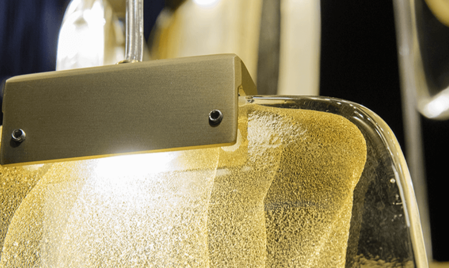 alloggia al suo interno un moderno supporto a led. Il corpo metallico è infine ancorato su una piastra in acciaio, verniciata in bianco, nero, oro.
