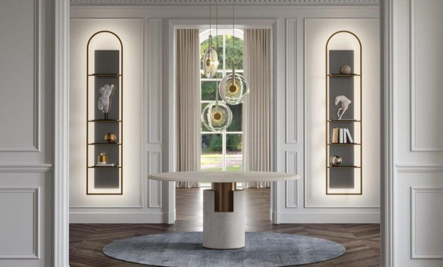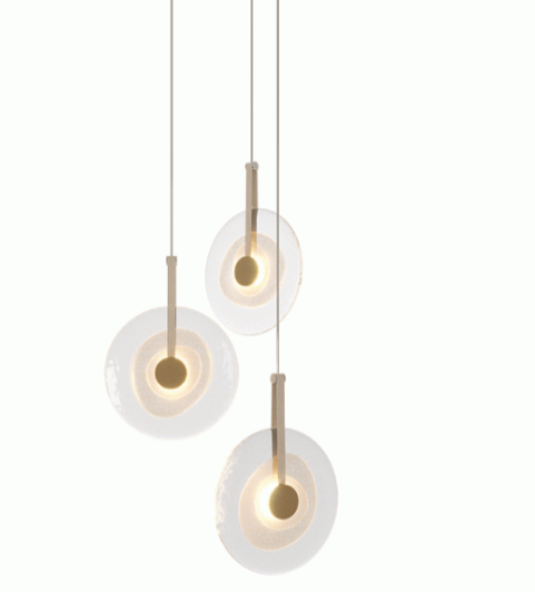 Il vetro, che riflette la luce e la diffonde nell’ambiente, è incastonato in un disco di metallo finitura oro opaco satinato e sostenuto da un supporto metallico rivestito in pelle color sabbia. Ciascun elemento è fornito di un rosone in metallo finitura oro opaco e di un cavo elettrico di supporto della lunghezza massima di 2 m.