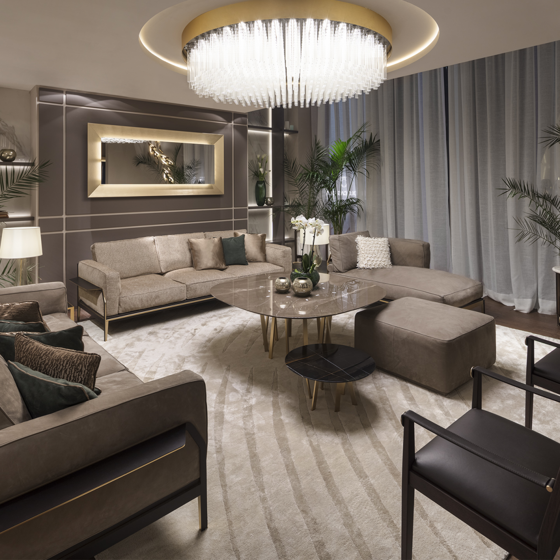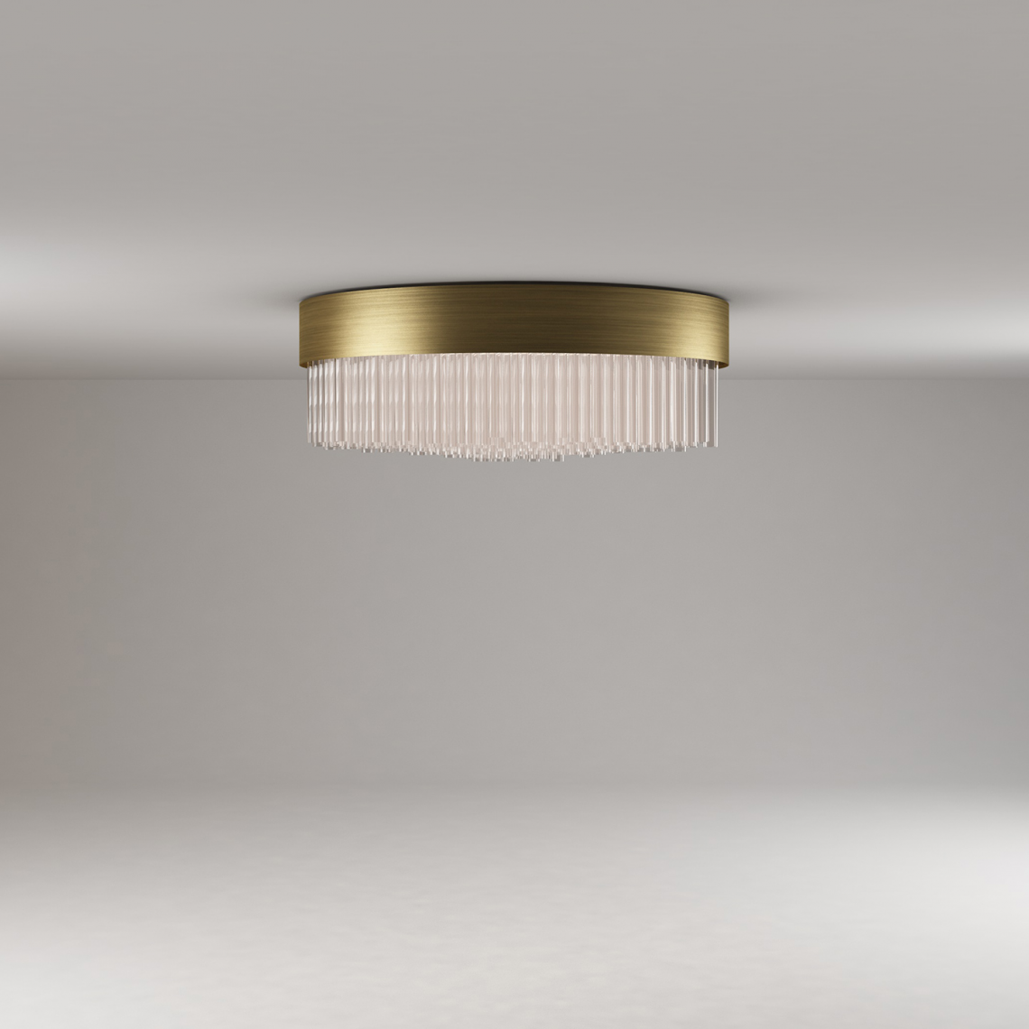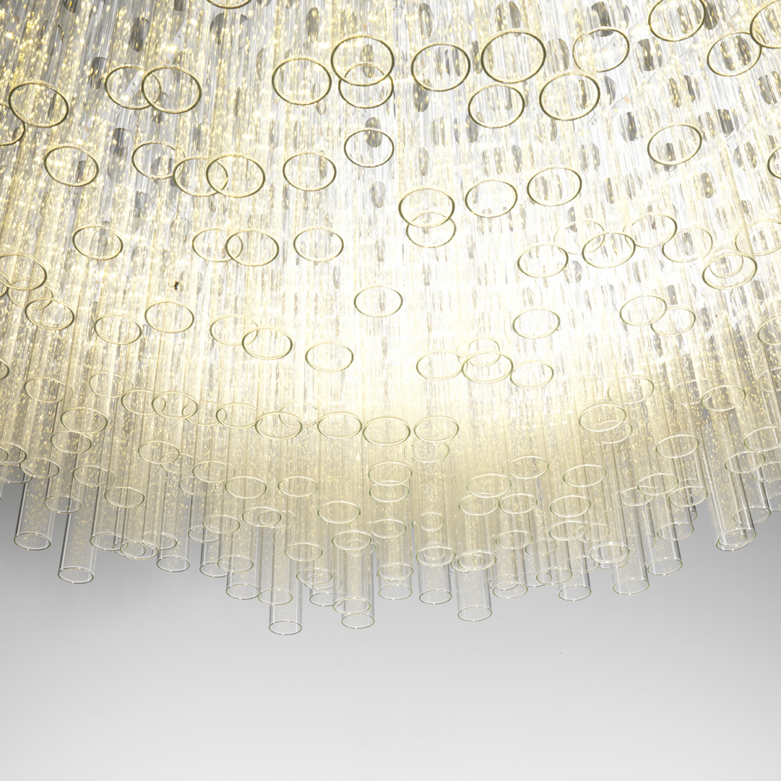è composta da un importante bouquet di tubi realizzati in vetro borosilicato veneziano e raccolti in una fascia metallica curvata, trattata con particolare trattamento a più strati, finitura oro opaco.