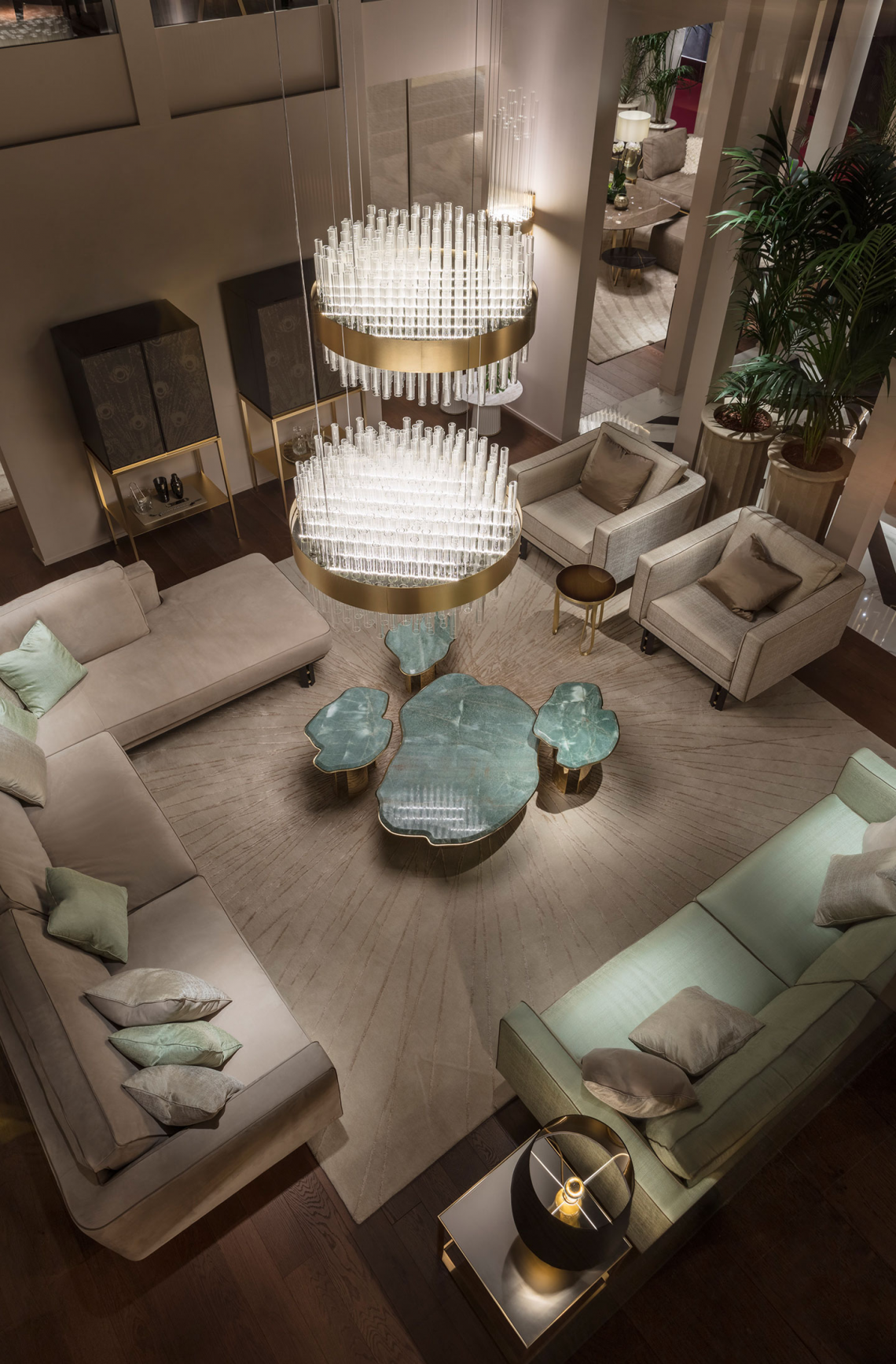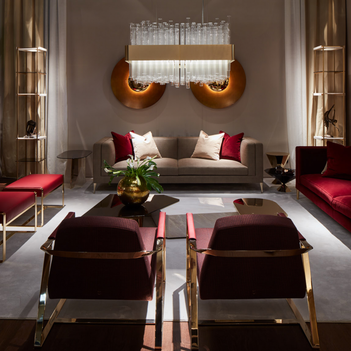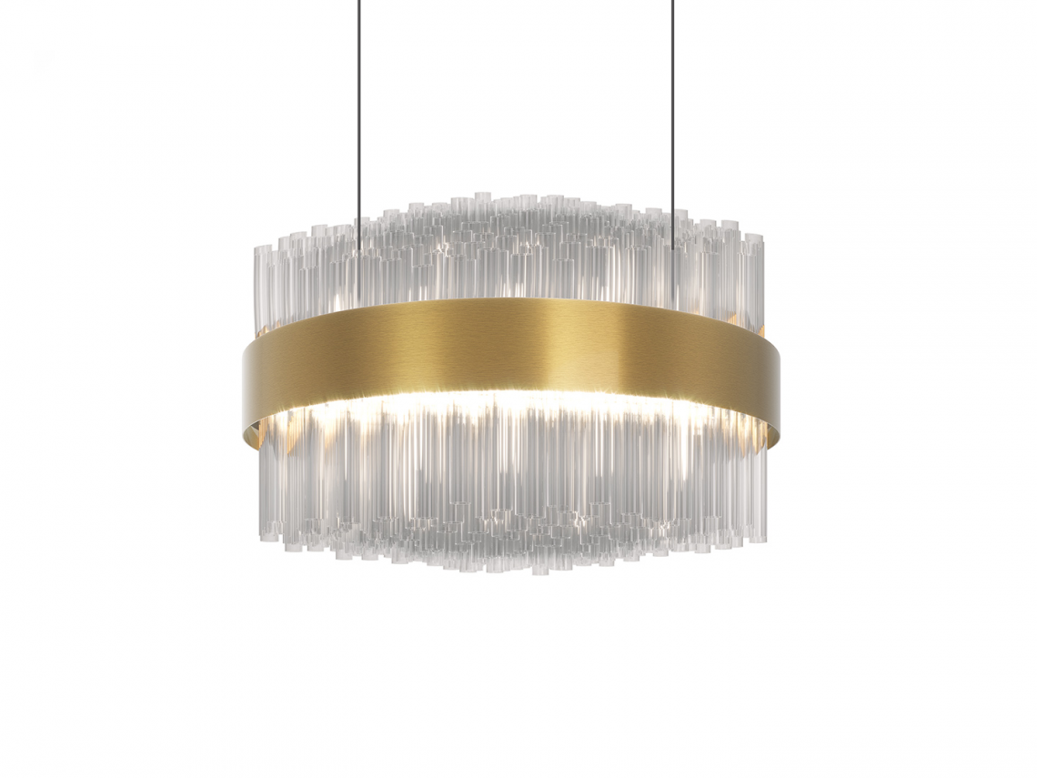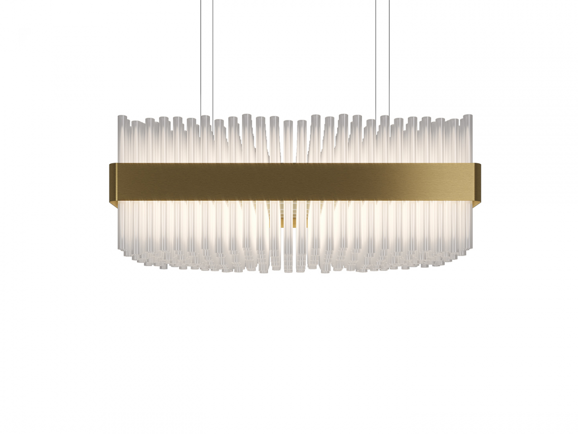 è composto da un importante bouquet di tubi realizzati in vetro borosilicato veneziano posti ad altezze sfasate e raccolti in una fascia metallica curvata, trattata con particolare finitura a più strati oro opaco. Il telaio portante interno è realizzato in metallo nichelato. Contropiastra opalescente per diffondere la luce.