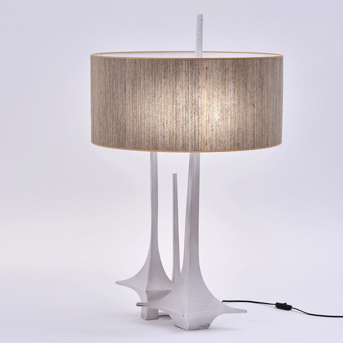 Lampada con base realizzata in ceramica artigianale di Faenza color bianco opaco. Il paralume -100% naturale- è realizzato in fibra di canapa nepalese. Sorgente luminosa E27.
