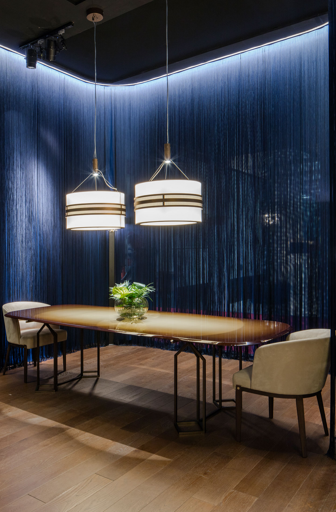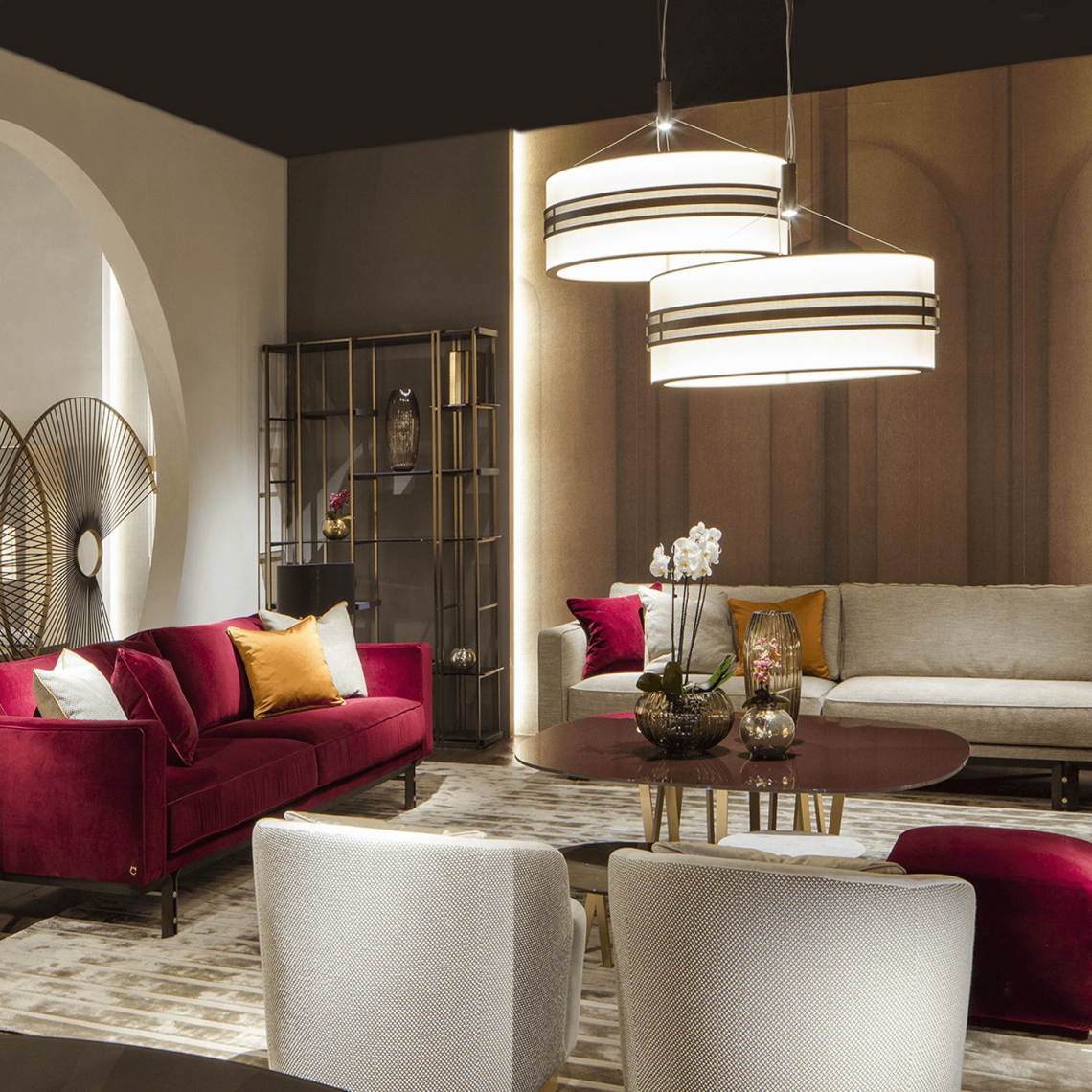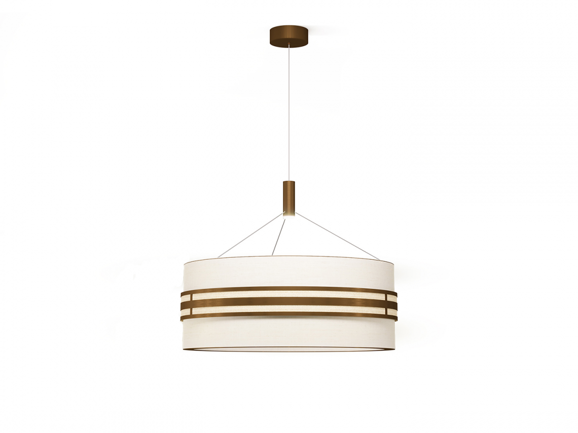 Lampada a sospensione di forma cilindrica composta da una struttura in metallo finitura bronzo con paralume interno/esterno in tessuto color avorio, al suo interno è alloggiata una moderna sorgente led. Il paralume è impreziosito esternamente da una fascia esterna rivestita con prezioso tessuto in fibra naturale di colore bronzo scuro, intrecciata manualmente.