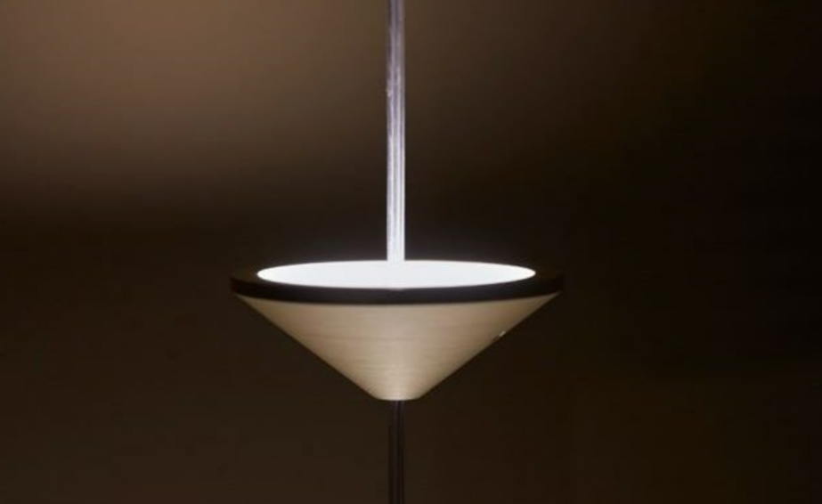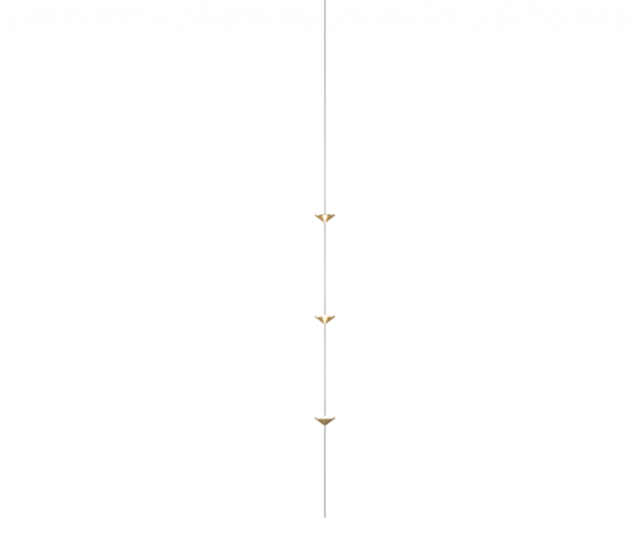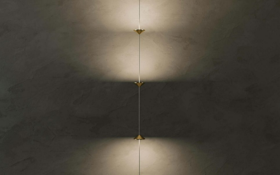 con finitura gold opaco ed emissione luminosa con piastrine led circolari. Il rosone a soffitto è sempre di forma conica, in metallo nella stessa finitura.Disponibile anche la versione a parete.