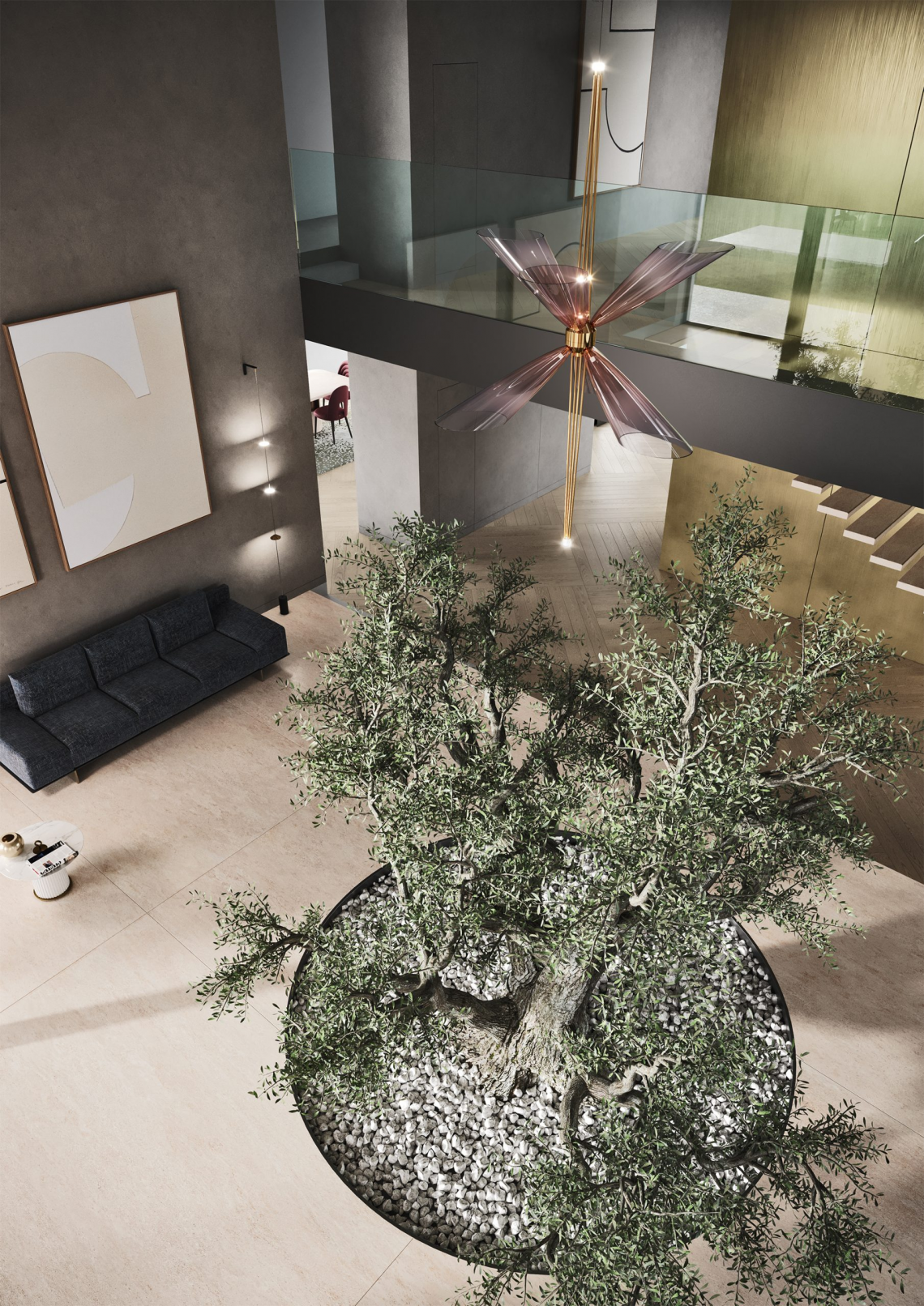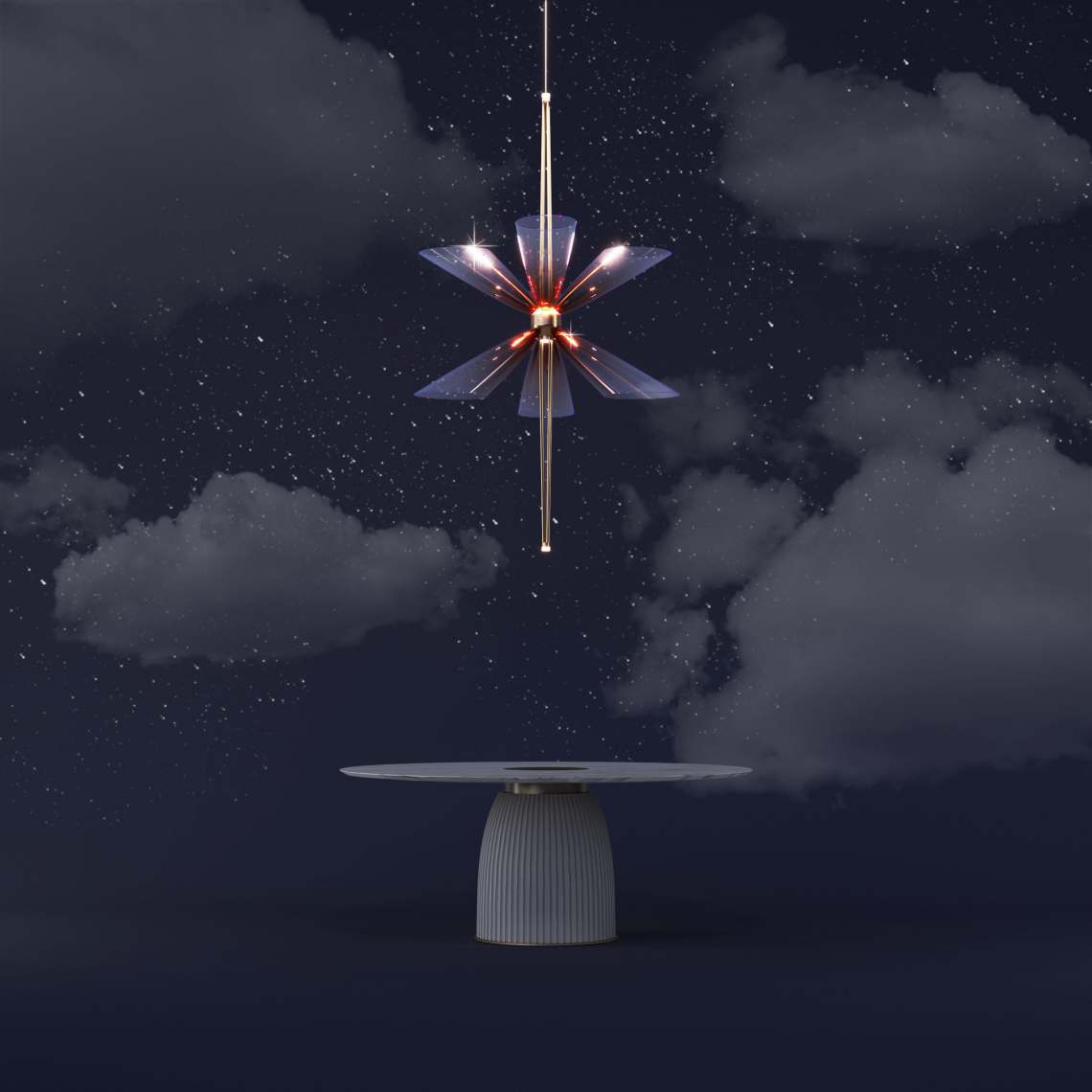 Stellantis è una scultura luminosa sospesa, immaginata per diventare il centro focale dell’ambiente. Suggestiva e poetica, è composta da sei coni in vetro fatti a mano artigianalmente, con una particolare sfumatura metallizzata in bronzo, realizzati ad uno ad uno dai maestri vetrai di Murano. Sono fissati su un’asta verticale in ottone opaco. Illuminati da sorgente led, gli elementi in vetro diffondono nell’ambiente tanti piccoli riflessi cangianti con un effetto espressivo e scenografico. Anche dimmerabile.