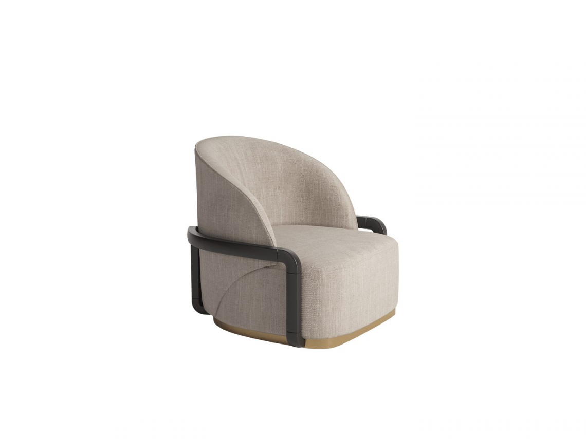 è realizzata con una struttura interna in multistrato di legno curvato con imbottitura in poliuretano a densità variabile. Ha un rivestimento non sfoderabile personalizzabile con pregiati tessuti, raffinate pelli bovine pieno fiore e nabuk. La seduta poggia su una base in legno color rovere tinto scuro oppure rivestita con profilo metallico con finitura oro.