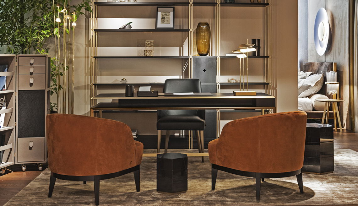 è realizzata con una struttura interna in multistrato di legno curvato con imbottitura in poliuretano a densità variabile. Ha un rivestimento, non sfoderabile, personalizzabile con pregiati tessuti, raffinate pelli bovine pieno fiore e nabuk. La seduta poggia su una struttura in legno laccato con vernice metallica color beige perlato RAL 7035.