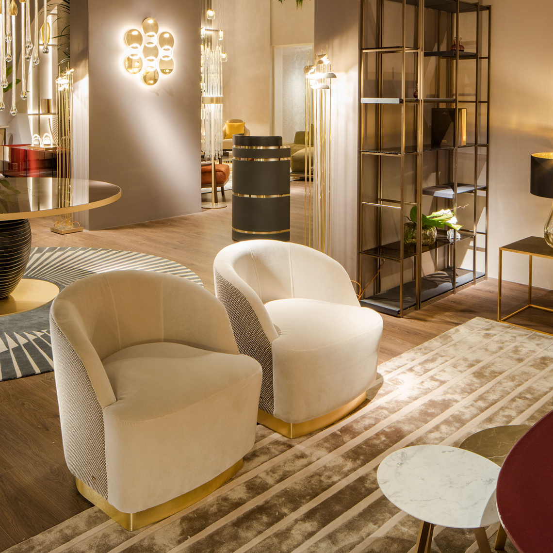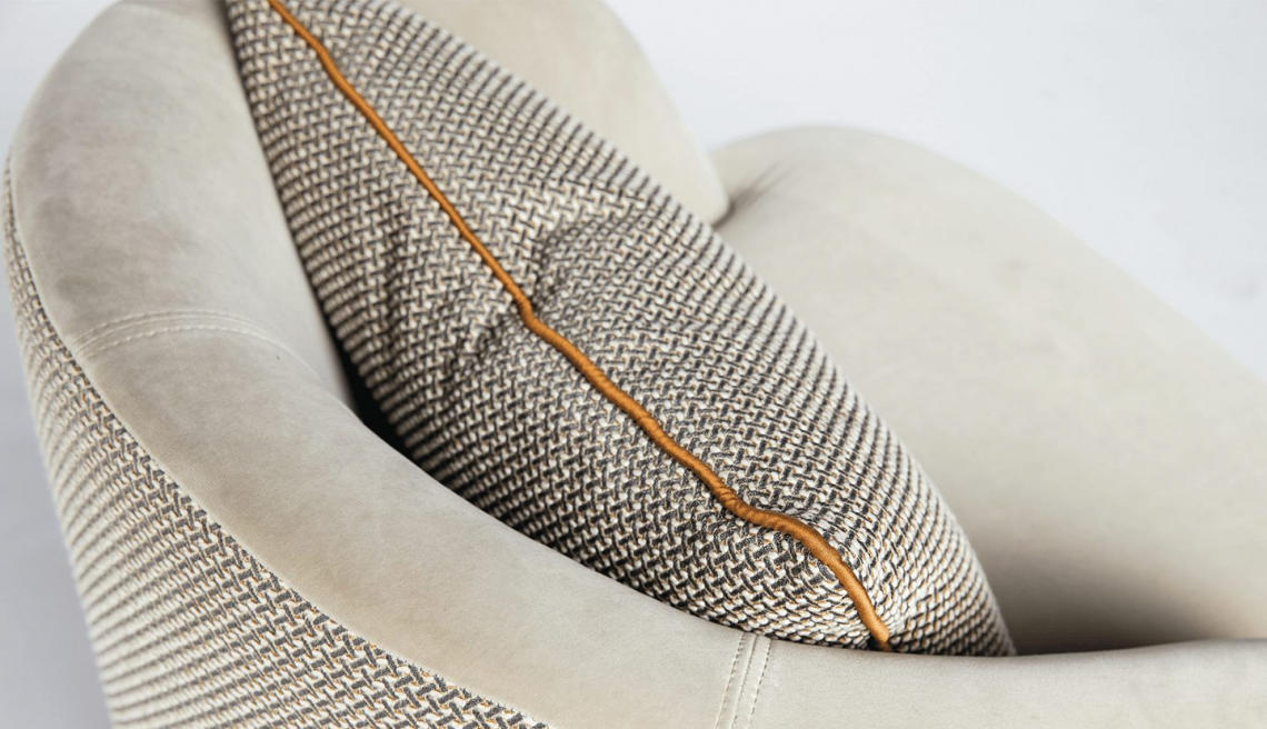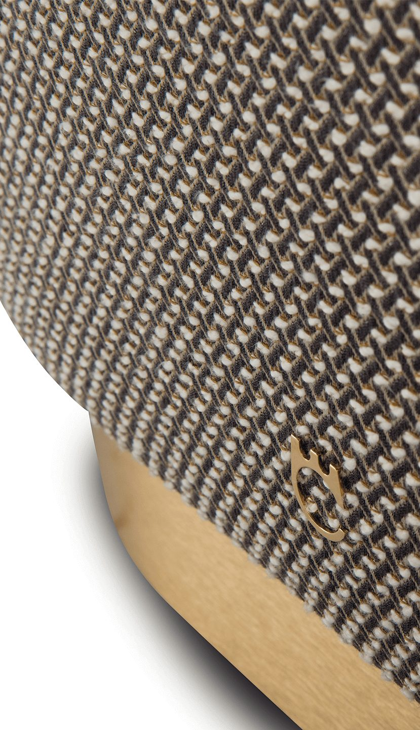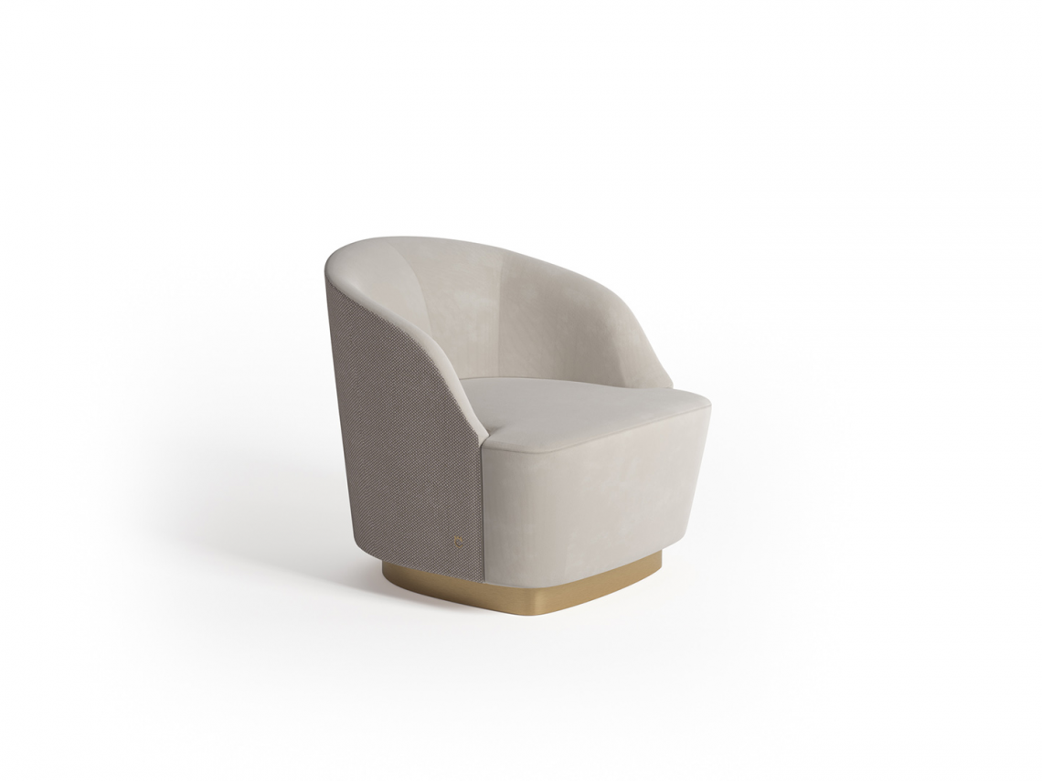Ha un rivestimento, non sfoderabile, personalizzabile con pregiati tessuti, raffinate pelli bovine pieno fiore e nabuk. La seduta poggia su un basamento girevole in laminato metallico oro satinato opaco.