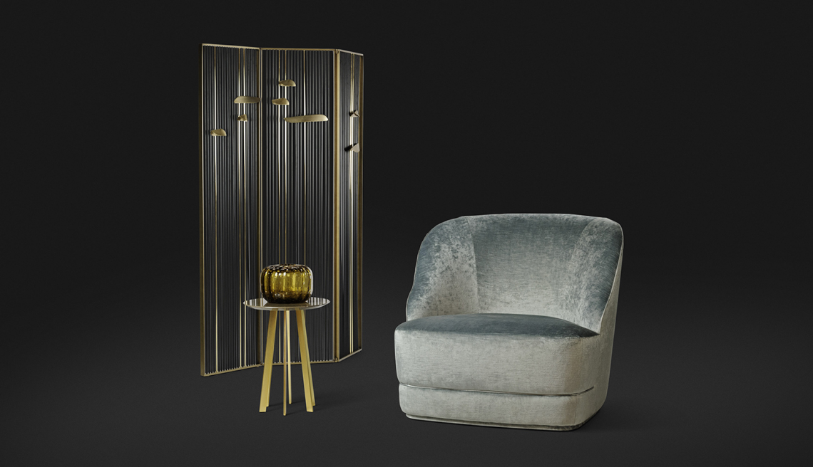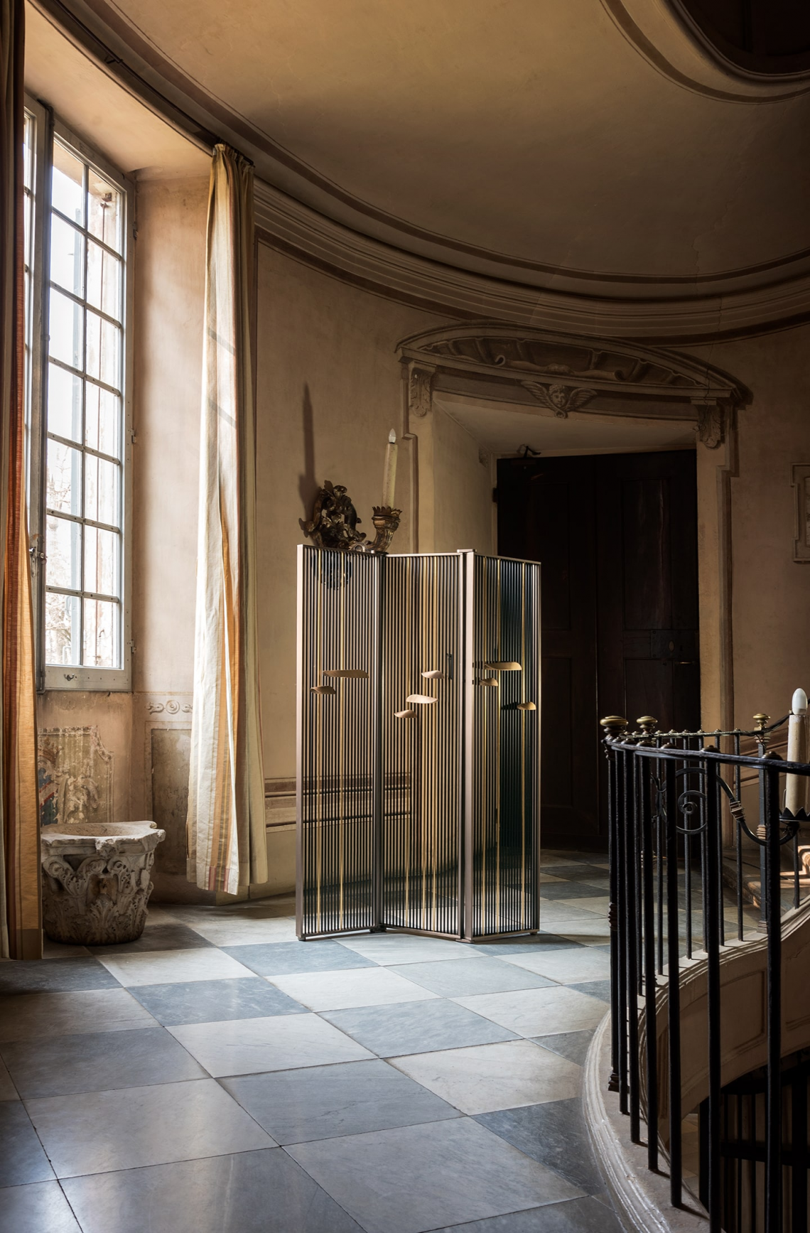 Il paravento ha una cornice in metallo finitura bronzo ottone opaco, steli in metallo in finitura brunito opaco e ottone lucido. Nelle aste in ottone sono inseriti elementi decorativi a forma di foglia, realizzati in metallo con finitura oro opaco, realizzati artigianalmente.