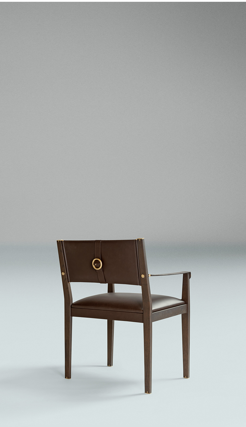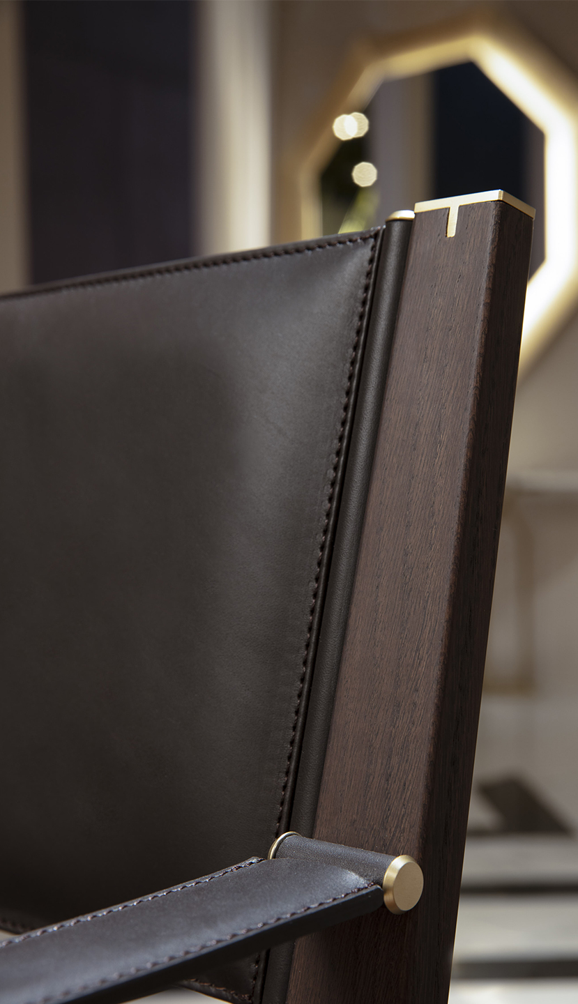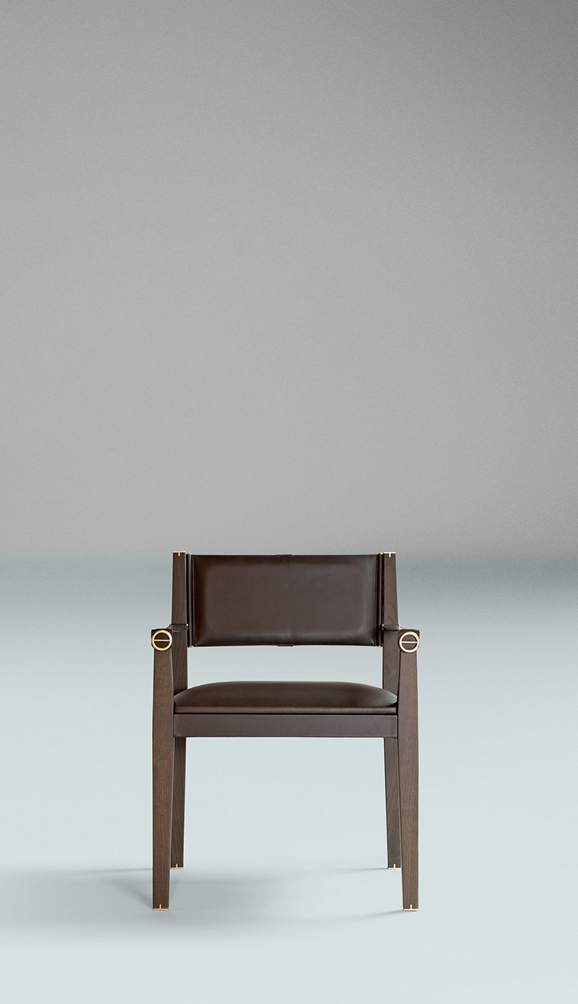 Una sedia polimaterica che profuma di viaggi esotici alla ricerca di un Eden perduto. Ispirata allo stile coloniale lo schienale e la seduta sono rivestiti in cuoio, mentre la ricercatezza della lavorazione della struttura in rovere tinto scuro è esalta dal contrasto cromatico e materico dei preziosi inserti in metallo con finitura oro opaco.