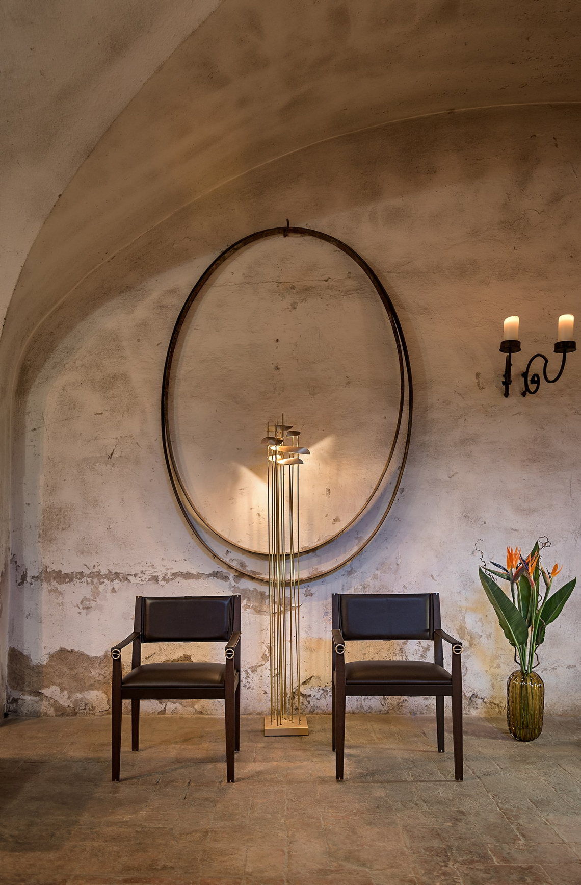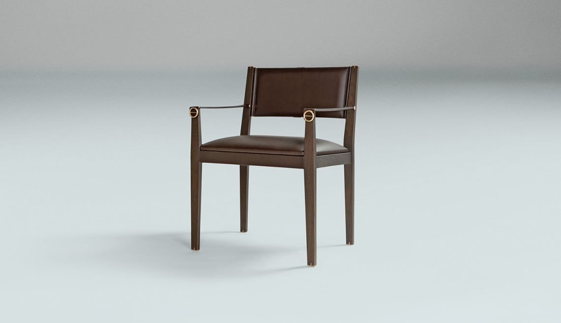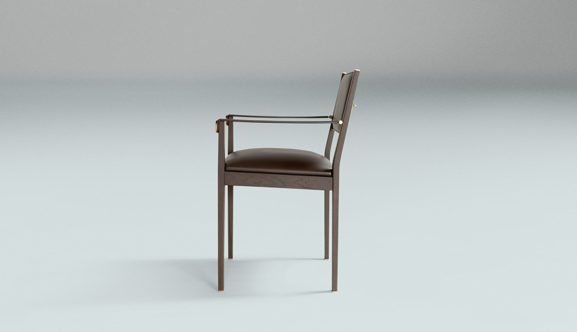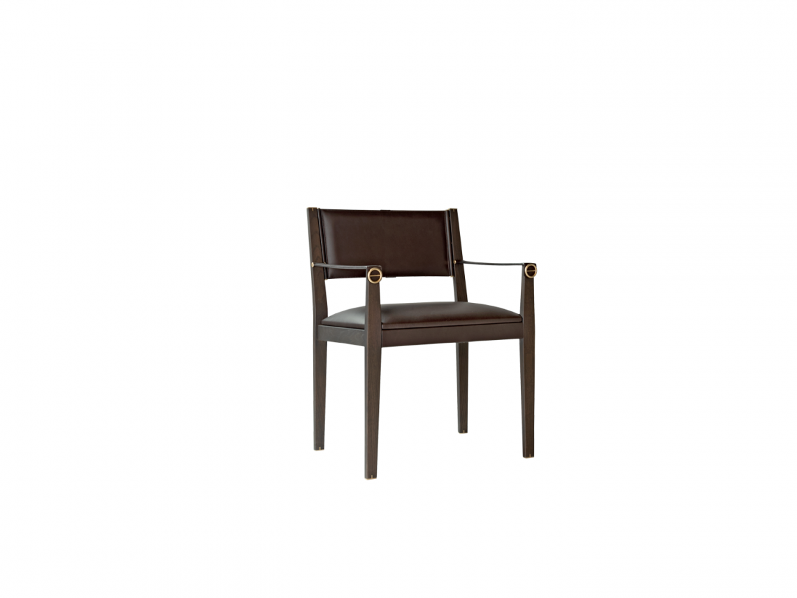 Una sedia polimaterica che profuma di viaggi esotici alla ricerca di un Eden perduto. Ispirata allo stile coloniale lo schienale e la seduta sono rivestiti in cuoio, mentre la ricercatezza della lavorazione della struttura in rovere tinto scuro è esalta dal contrasto cromatico e materico dei preziosi inserti in metallo con finitura oro opaco.