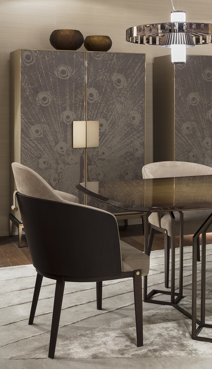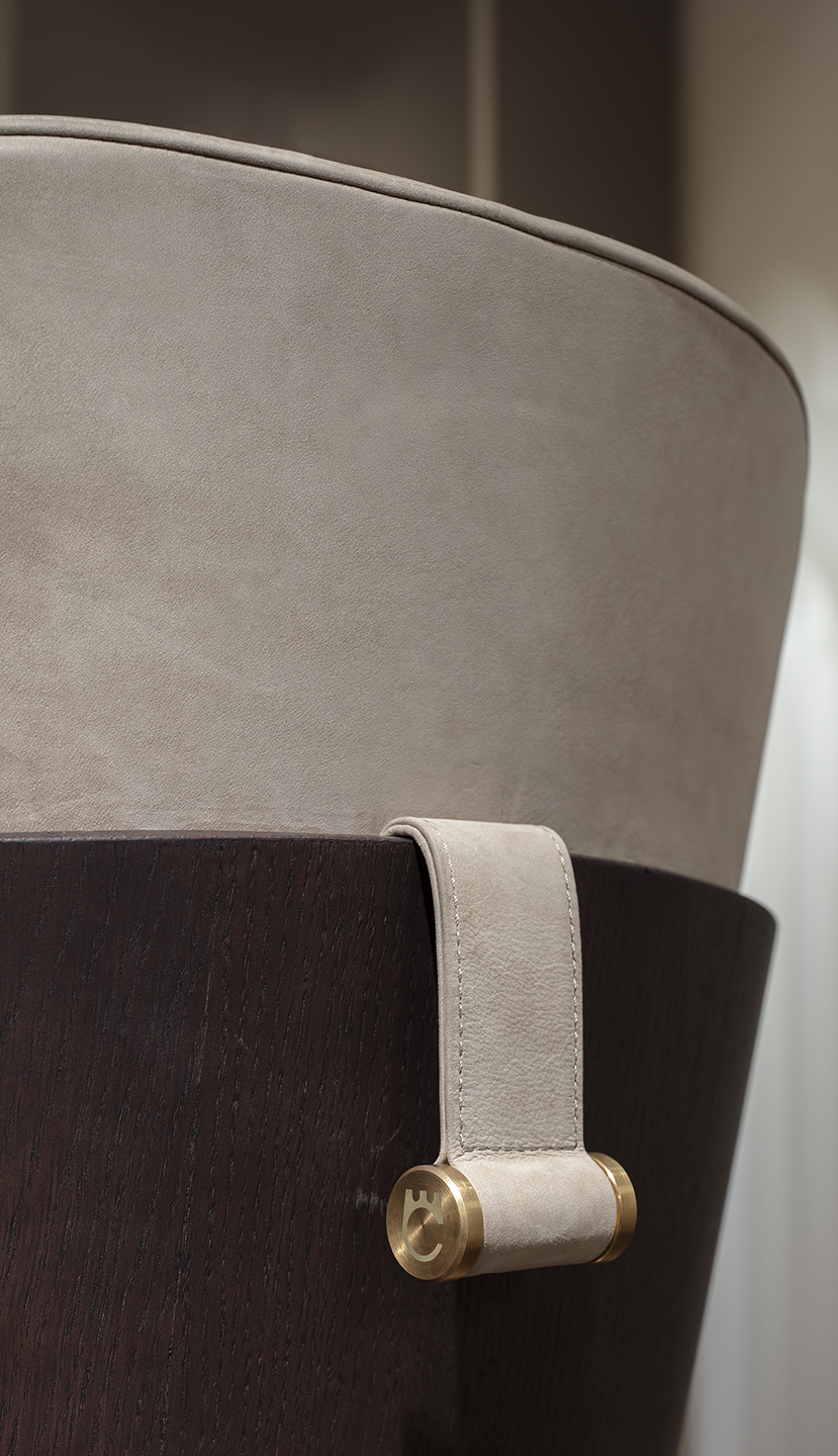 HIGH CHAIR: struttura in rovere tinto scuro, seduta schienale in legno di rovere tinto scuro, seduta imbottita in poliuretano espanso sagomato a quote differenziate e rivestita in tessuto o pelle a campionario. Impreziosisce il disegno un pregiata maniglia decorativa in pelle e ottone opaco, posizionata sul retro dello schienale. Non sfoderabile.