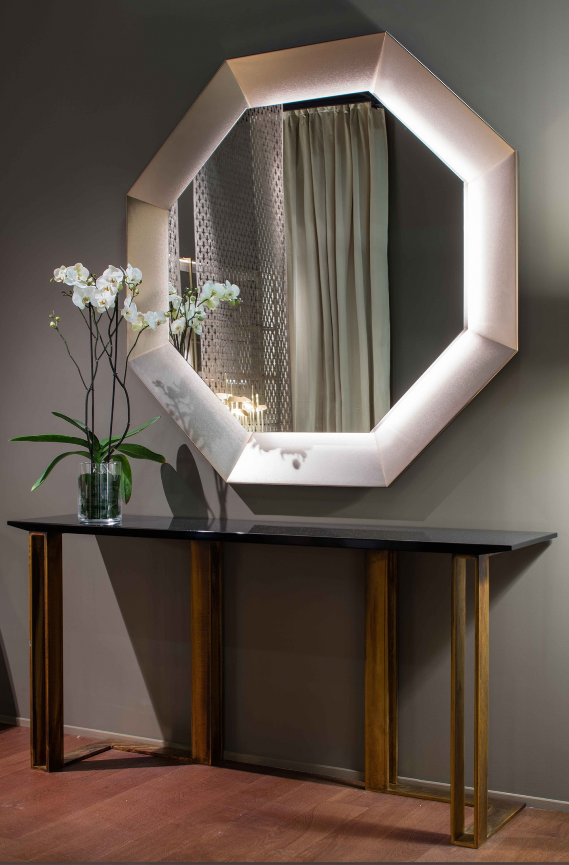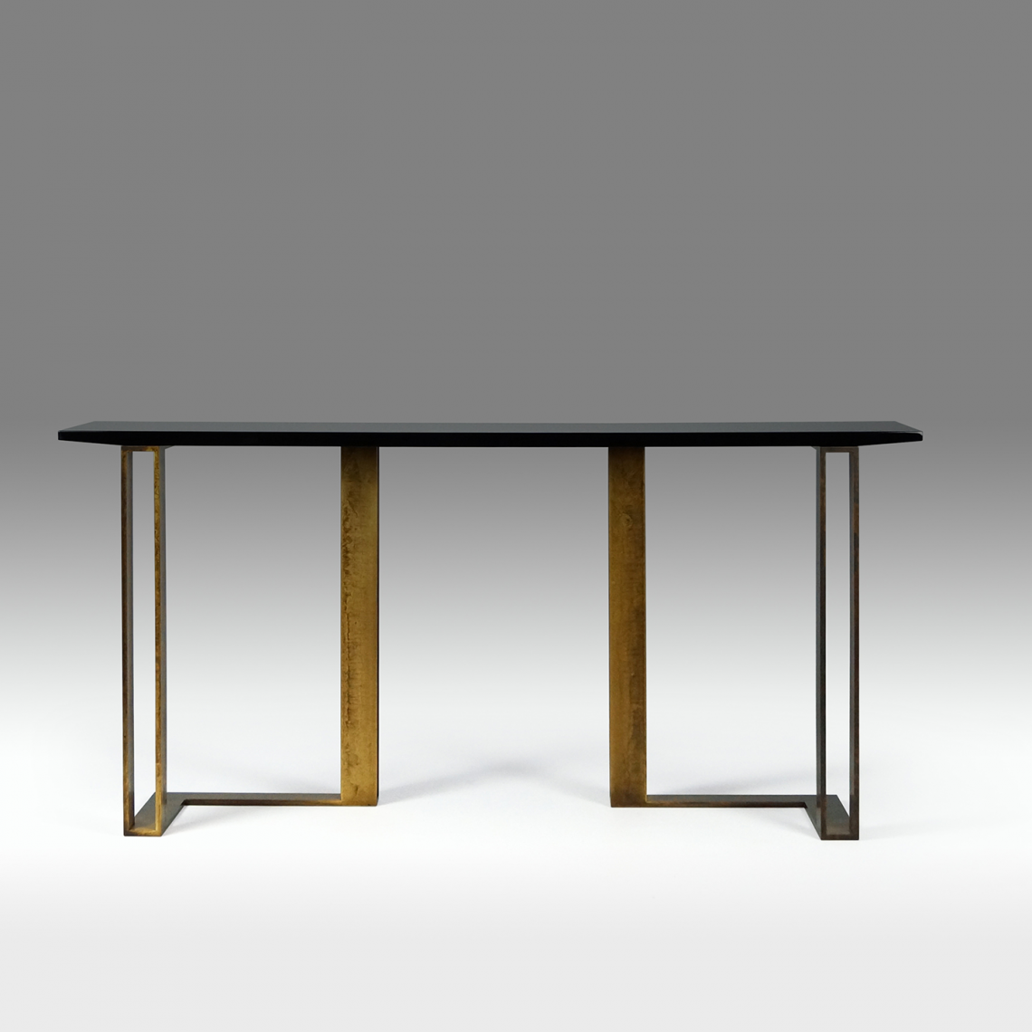 il laccato nero, spessore 3.2 cm. Si tratta di una console con un piano in mdf verniciato lucido nero 100 gloss, con i lati corti dal bordo inferiore leggermente rastremato, e una doppia base realizzata in metallo pieno con elegante lavorazione in ottone fiammato opaco. Disponibile la versione Pearl & Gold con piano laccato lucido col. bianco perla NCS S 1500N.
