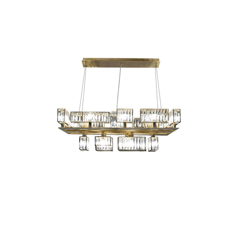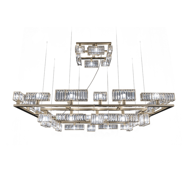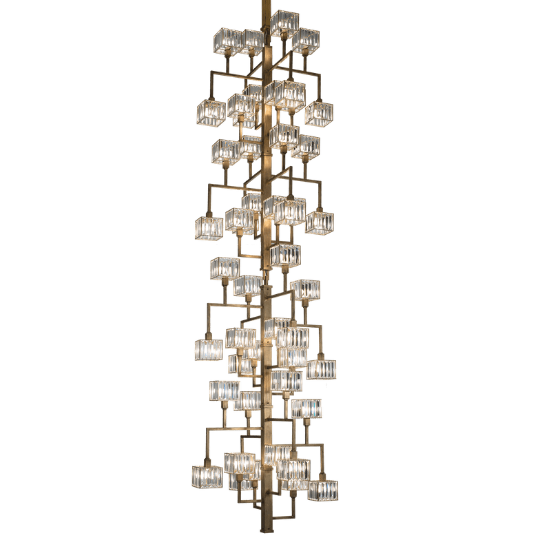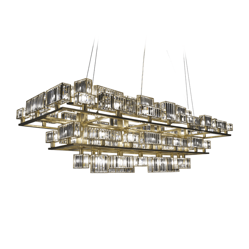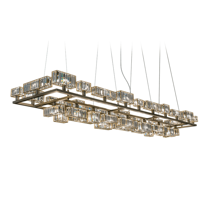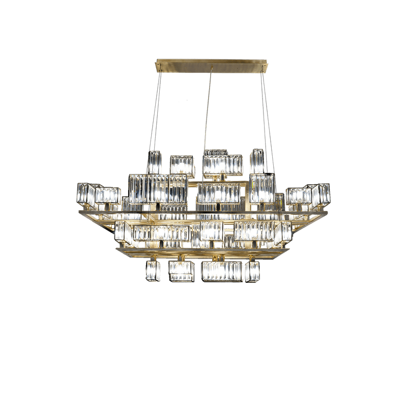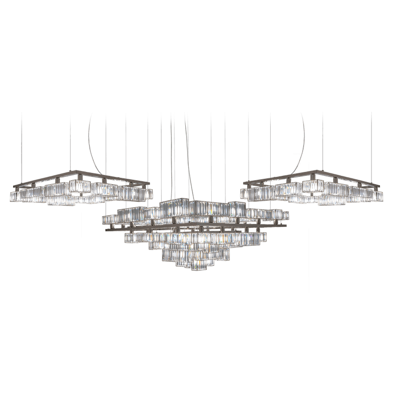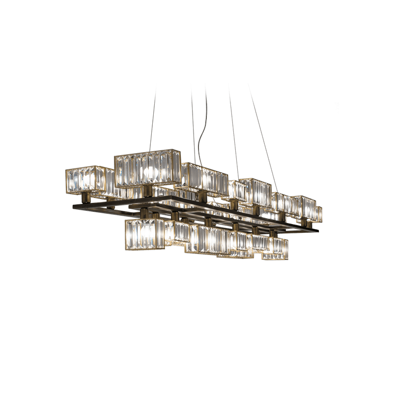 The peculiarity of the collection lies in the high number of possible combinations and the ease in creating new forms and dimensions due to the repetitions of the crystal module: an ensemble of parallelepipeds of various heights made of transparent crystal lozenges, hand-assembled over a metallic chassis.