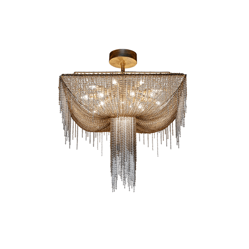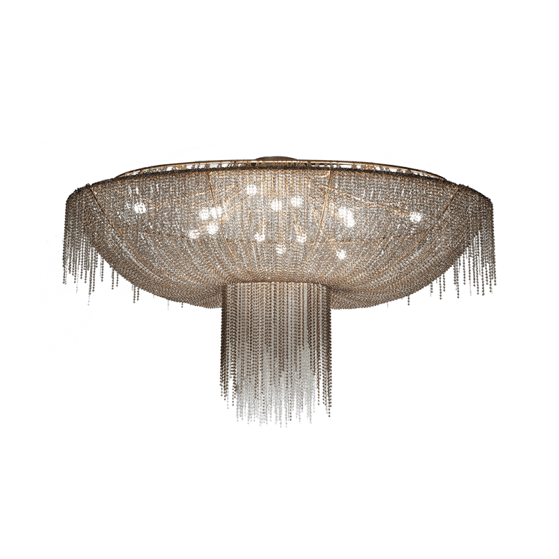 A drapery, some feathers, some precious gems: this is what comes to mind with Burlesque, a family of chandeliers with a strong personality. The protagonists here are the pearls with that multitude of precious strings that, just like a veil, lie down over the metallic structure of the lampshade, making it almost invisible. A collection capable of expressing a certain idea of femininity: mysterious, intense.