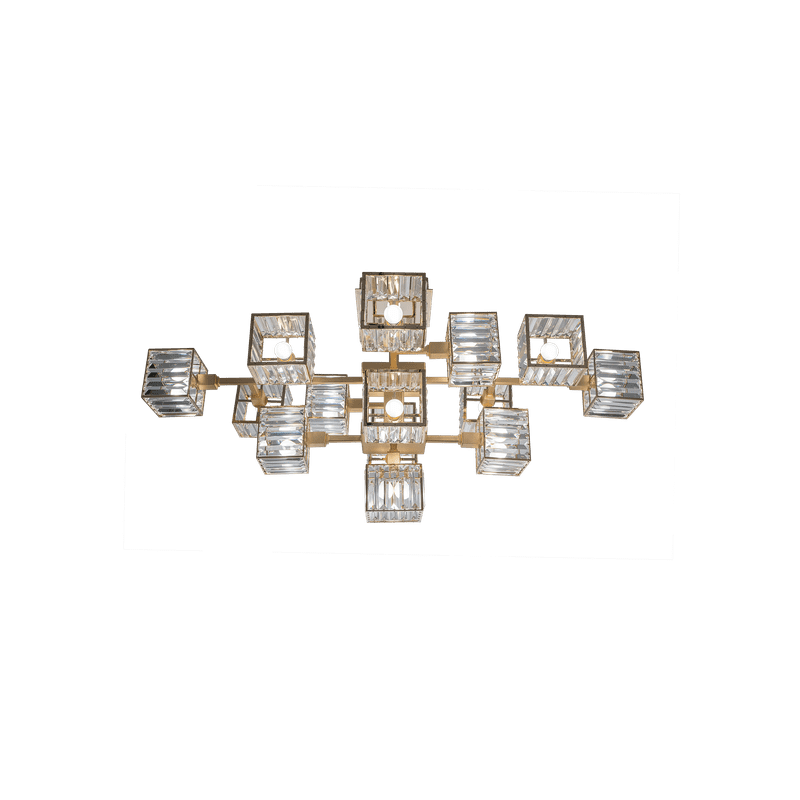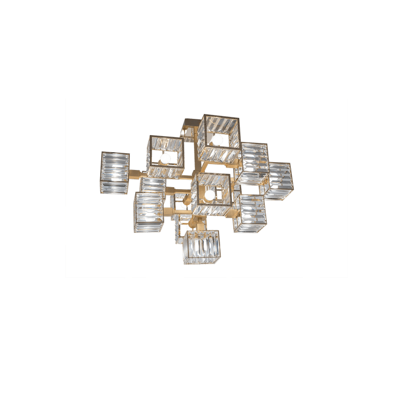 The peculiarity of the collection lies in the high number of possible combinations and the ease in creating new forms and dimensions due to the repetitions of the crystal module: an ensemble of parallelepipeds of various heights made of transparent crystal lozenges, hand-assembled over a metallic chassis.