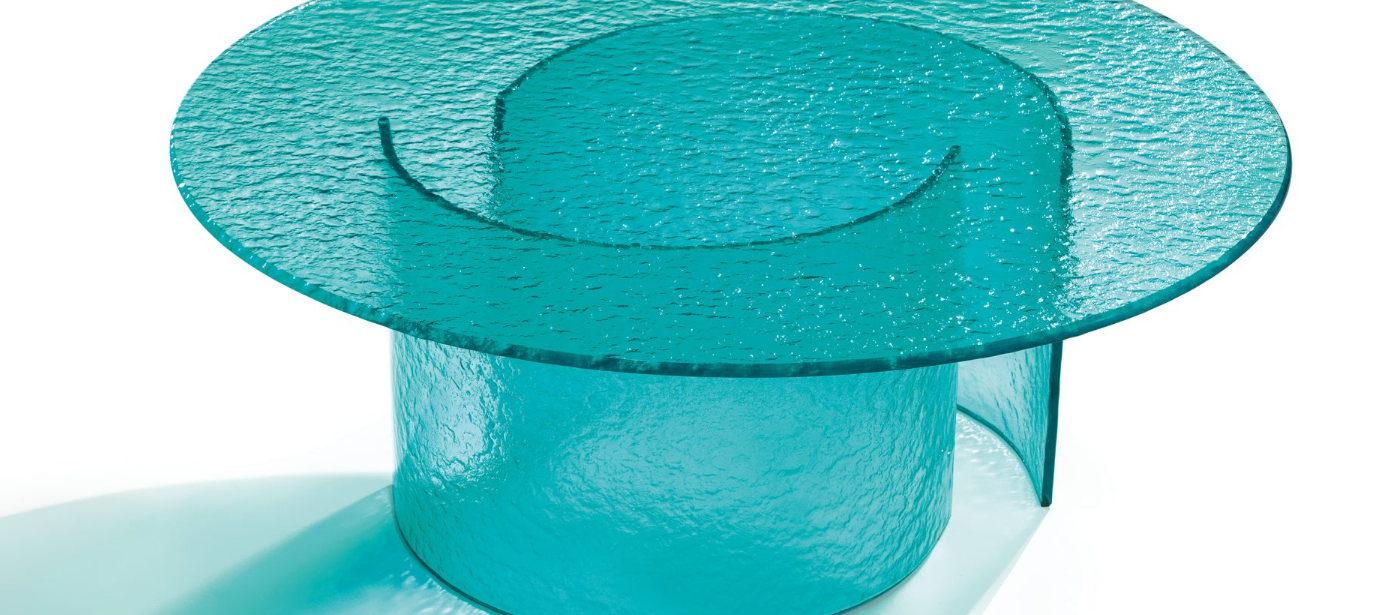 Tavolini con base e top in vetro Acqua nelle colorazioni fumè, trasparente, ambra, blu, smeraldo.