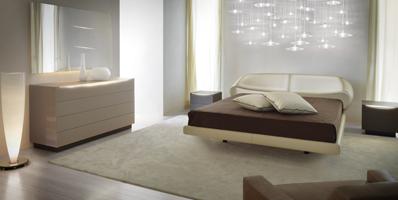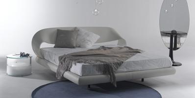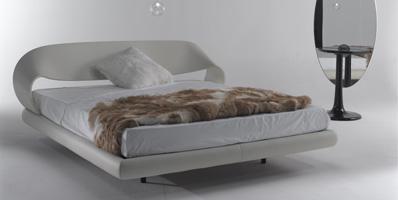 Bed with curved headboard and sides upholstered in fabric or in leather.
