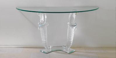Console with legs in handmade Murano glass transparent or pure gold finish and plinth in smoked mirror glass.Extraclear glass top with 45° bevel.