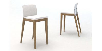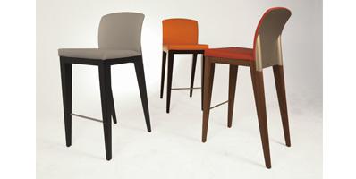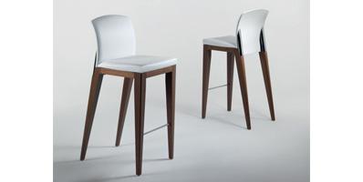 Bar stool with wooden legs in matt or shiny lacquered finish or in same colour as the leather or in Canaletto walnut. Back in satin titanium or brass finishing or in shiny chrome or black-nickel finish. Upholstery available in fabric, velvet or leather.