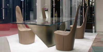 Chair with wooden structure. Upholstery in fabric, leather or velvet with San Marco quilting. Available with wheels or with magnetic swivel base. Optional upholstered armrests.