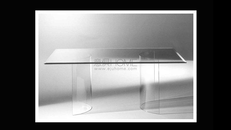 Dining table collection with base in curved glass 12 mm thick. Glass top 12 mm thick with 45° bevel.