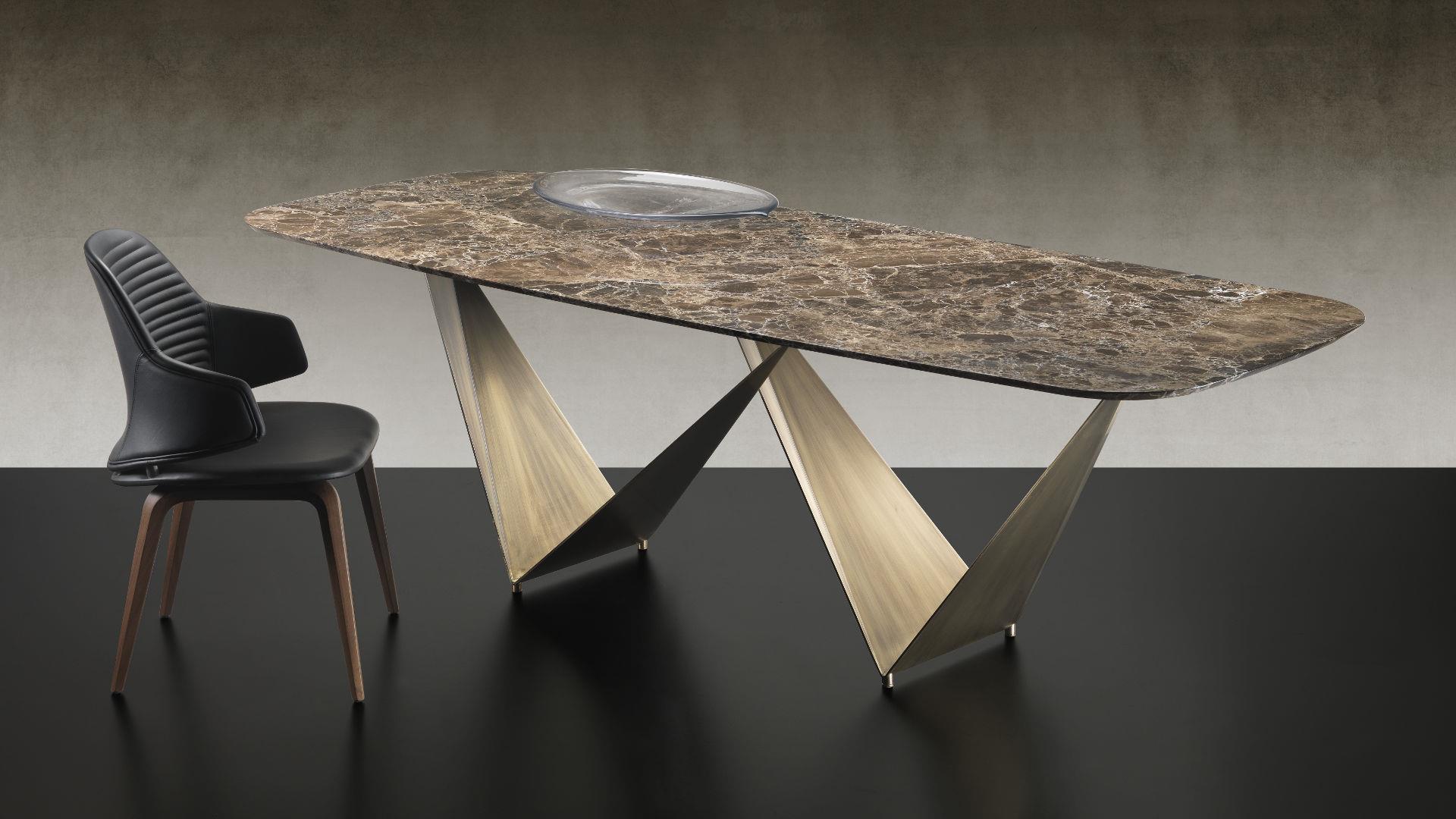 Dining table. Metal bases in Grafite, scratchy steel or in satin brass or titanium finishing. Top in tempered 15mm thick transparent glass.