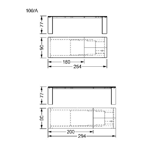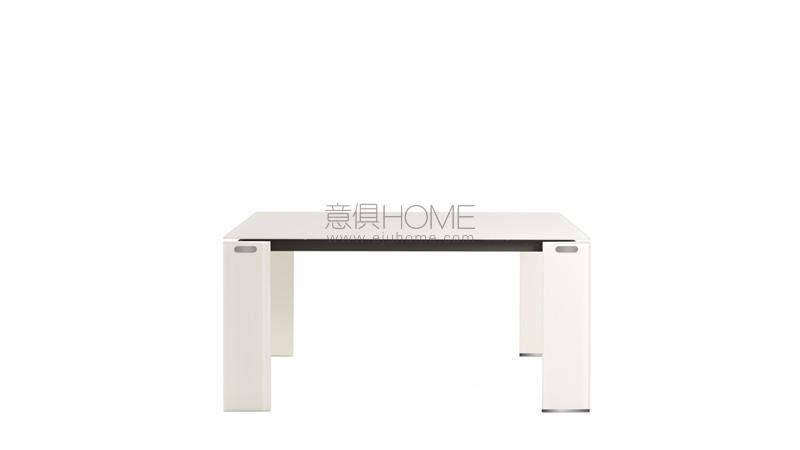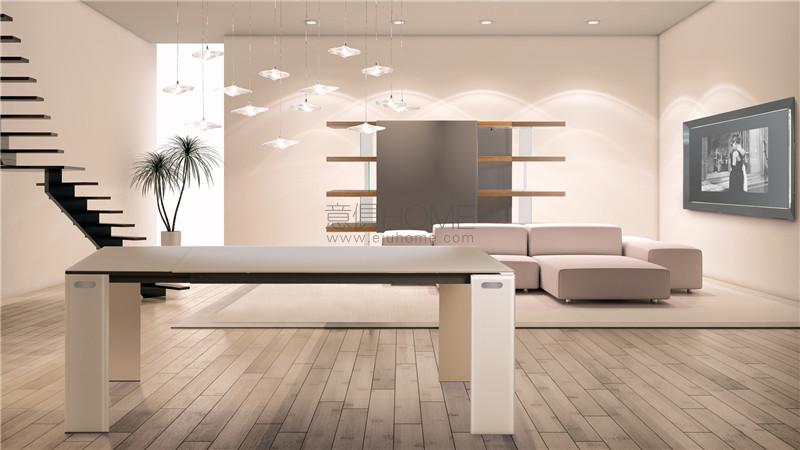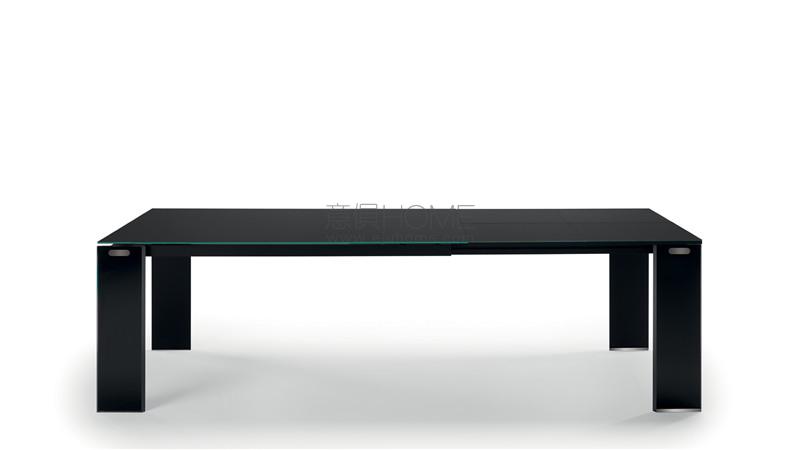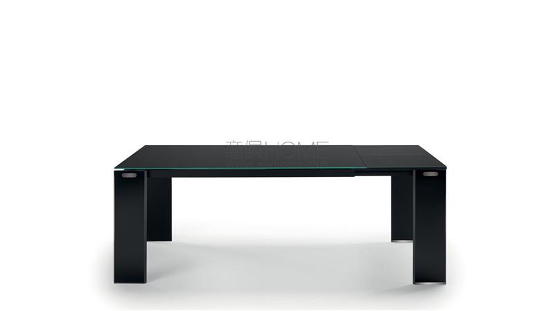 Extension table with top in lacquered or etched lacquered glass. Single or double extension 45cm or 94cm long with double leaf opening, covered in glass, matching with the top. Legs in lacquered or etched lacquered 15 mm thick glass with wheels.