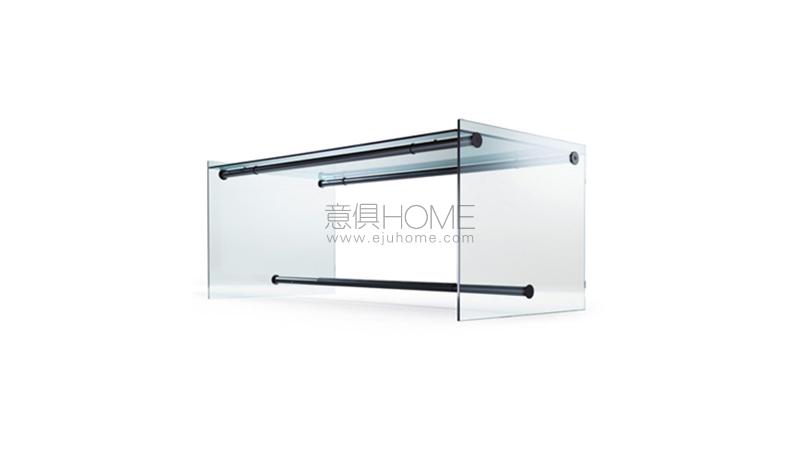 Desk with glass sides 12 mm thick and glass top 10 mm thick. Metal tubular supports black painted or in titanium finish.