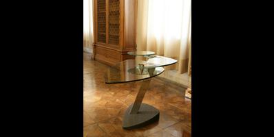 Desk with shaped tops in tempered 15 mm thick glass. Base and support in aluminium painted metal. Optional available: round glass shelf for printer and metal PC-tower support.