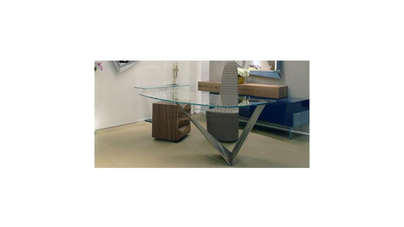 Desk with metal base in Grafite, satin brass or titanium finish or in scratchy steel finishing. Swivelling wooden unit with 3 drawers with shaped fronts in Canaletto walnut or in matt lacquered finish or with straight fronts covered in lacquered glass. Support in brushed steel. Shaped top in transparent tempered glass 15 mm thick with polished edges with cable hole or in Bevel Wood.