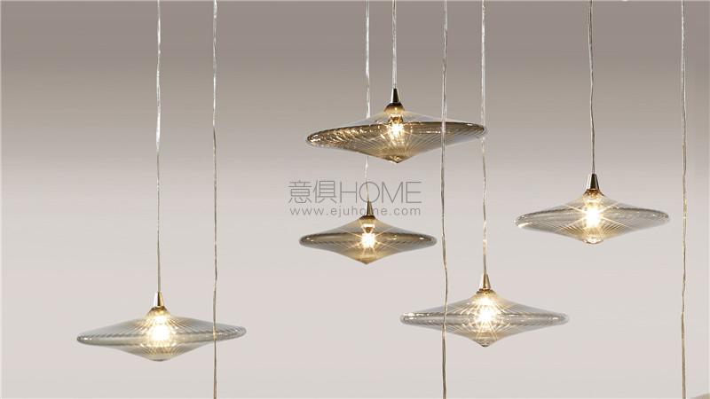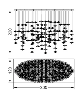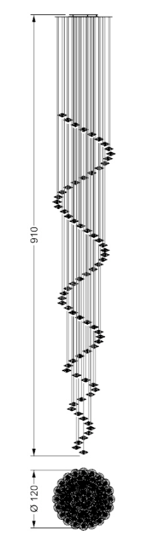 Chandelier with support in white or black lacquered or mirror glass and pendant elements in blown borosilicate glass, transparent or coloured with LED. It is possible to realize customized versions for dimensions, length and shape.