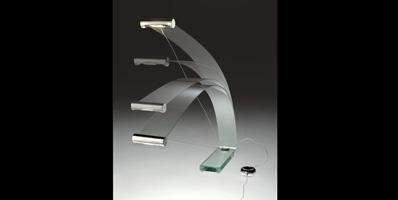 Table lamp with base in extra-clear glass 19mm thick and stand in flexible glass 0.8mm thick. Lighting component in polished aluminium with LED, warm lighting. Height adjustment through a transparent cable on a mechanic-spring- button.