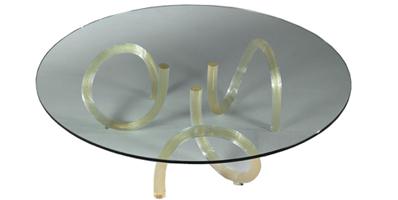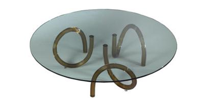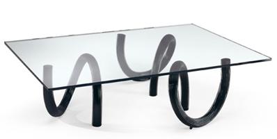Coffee table with Murano glass legs in various finishes and colours: smooth and transparent with black or green core; smooth with polished or frosted finish in blue or green; ribbed in transparent, tea or gold colour. Glass top 12mm thick.