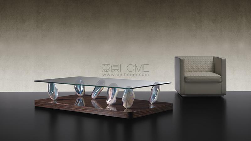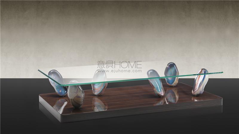 Coffee table with base in shiny lacquered wood or in shiny ebony wood 80 mm thick with rounded corners. 6 legs in Murano glass in Calcedonio or amber colour. Top in extra-clear glass 12mm thick with 45° bevel and rounded corners R50mm