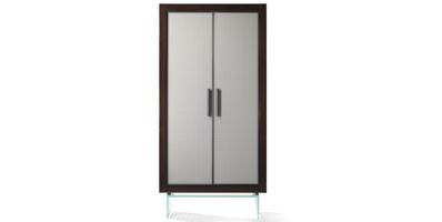 Cabinet with structure in shiny lacquered wood or in shiny ebony wood. 2 doors in Dune, San Marco or Vienna pattern design glass with shaped metal handles, metal frame and LED lighting. Base in extraclear glass matching the door pattern.