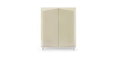 Cupboard in wood with two doors. Available in: matt or shiny lacquered, satin brass or titanium finishing or in Canaletto walnut. Glass shelves inside. Legs in transparent glass or in brass or titanium finished metal.